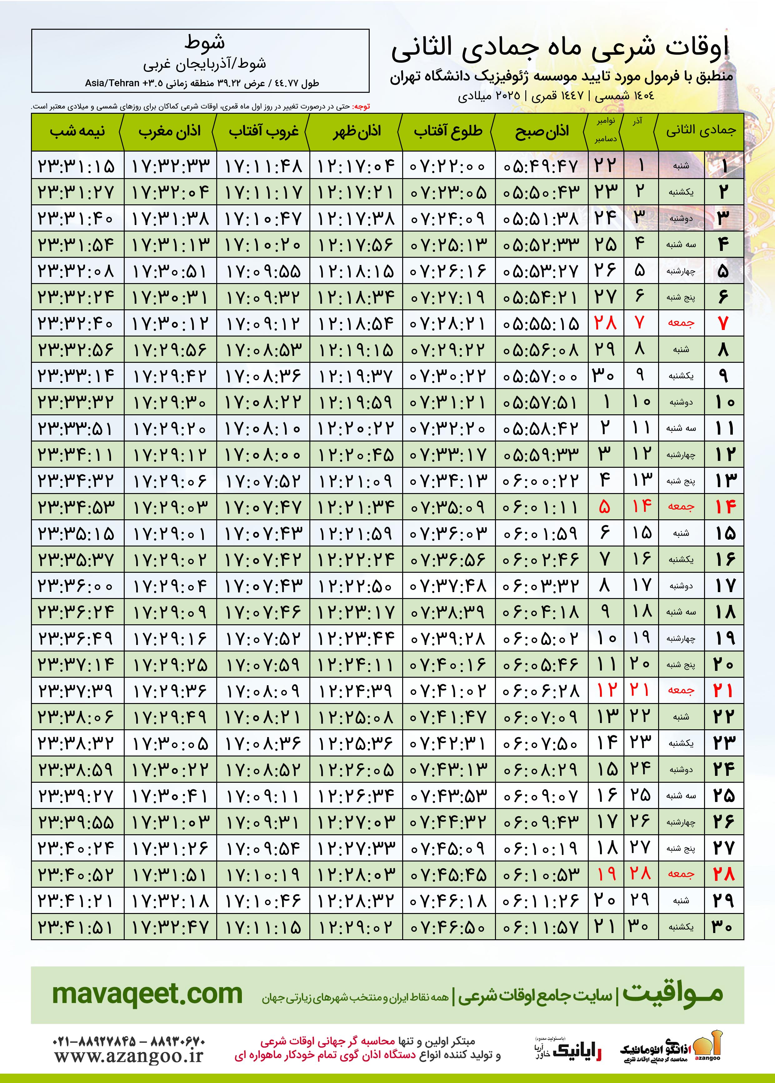 اوقات شرعی ماه جمادی الثانی ١٤٤٧ هـ.ق شهر شوط بر