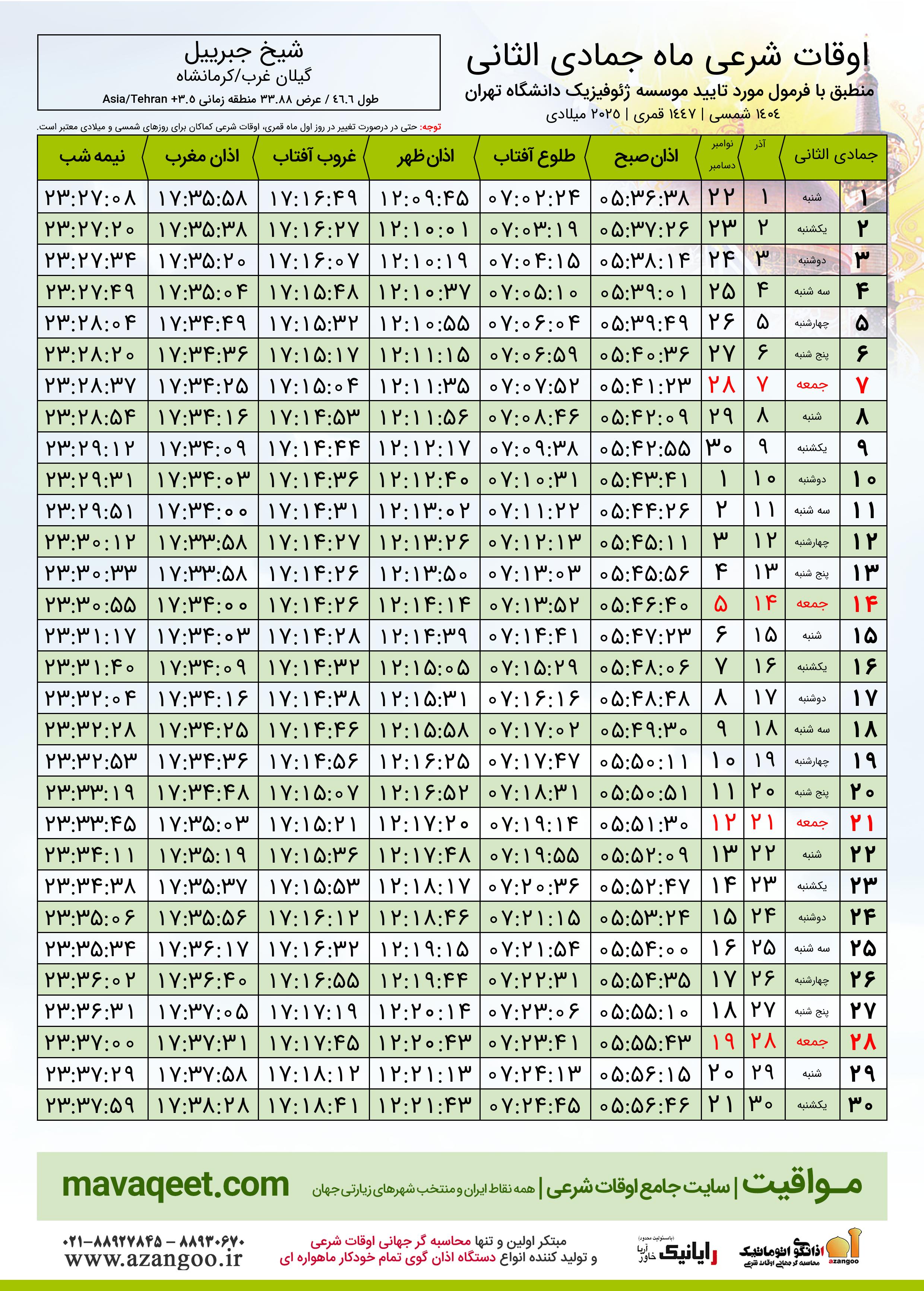 جدول اوقات شرعی جمادی الثانی ١٤٤٧ قمری شهر شیخ جبرییل