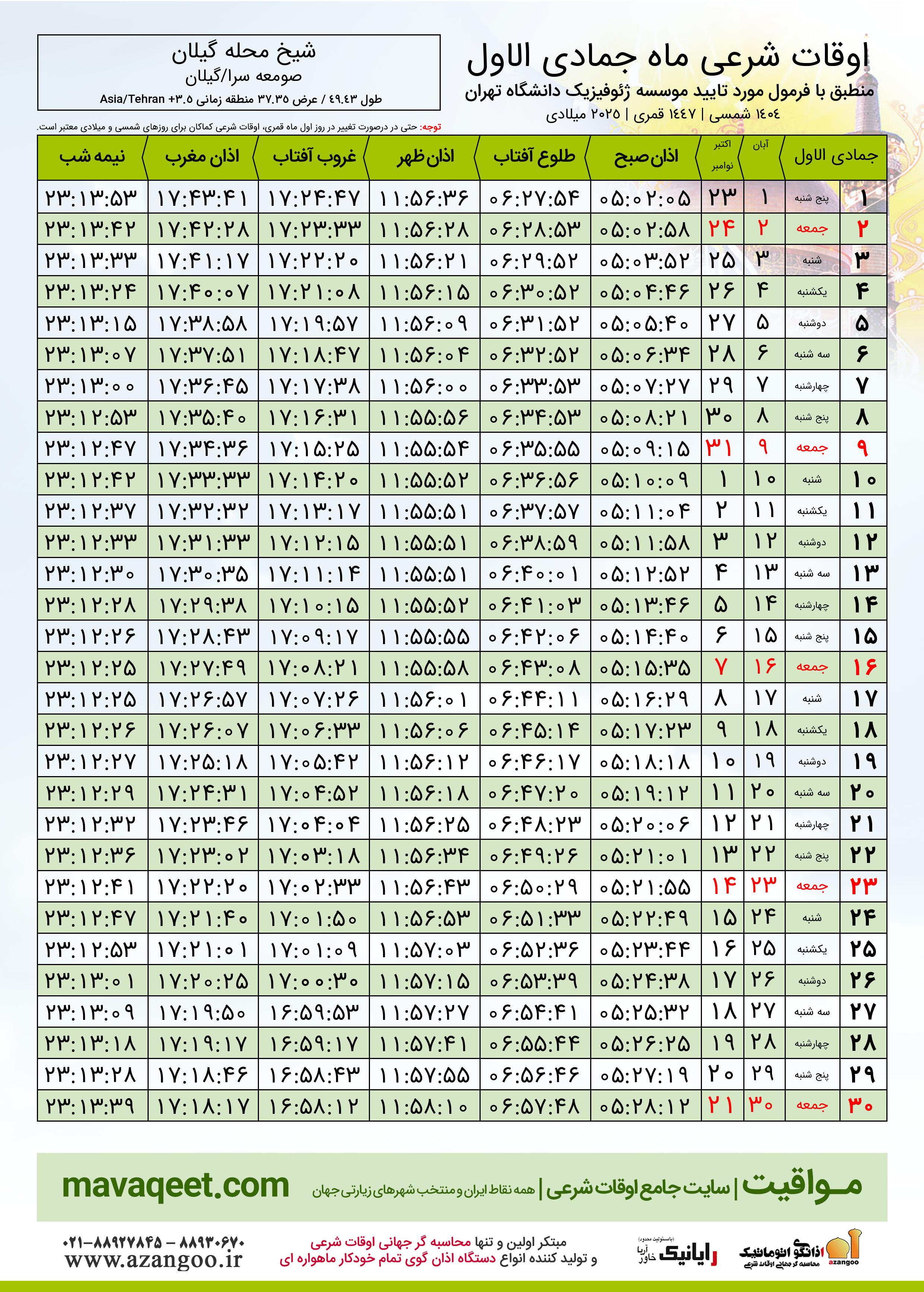 جدول اوقات شرعی جمادی الاول ١٤٤٧ قمری شهر شیخ محله گیلان