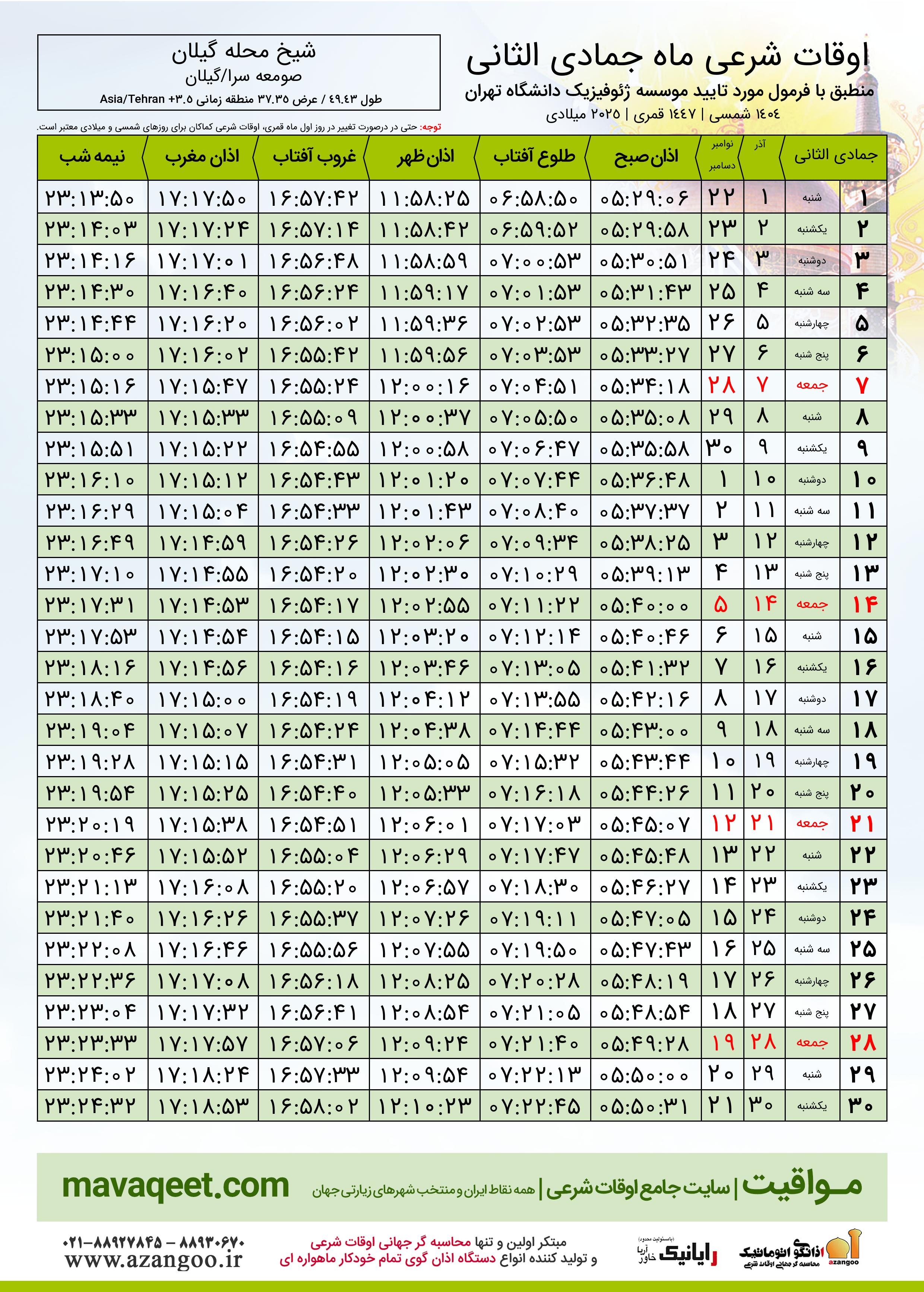 جدول اوقات شرعی جمادی الثانی ١٤٤٧ قمری شهر شیخ محله گیلان