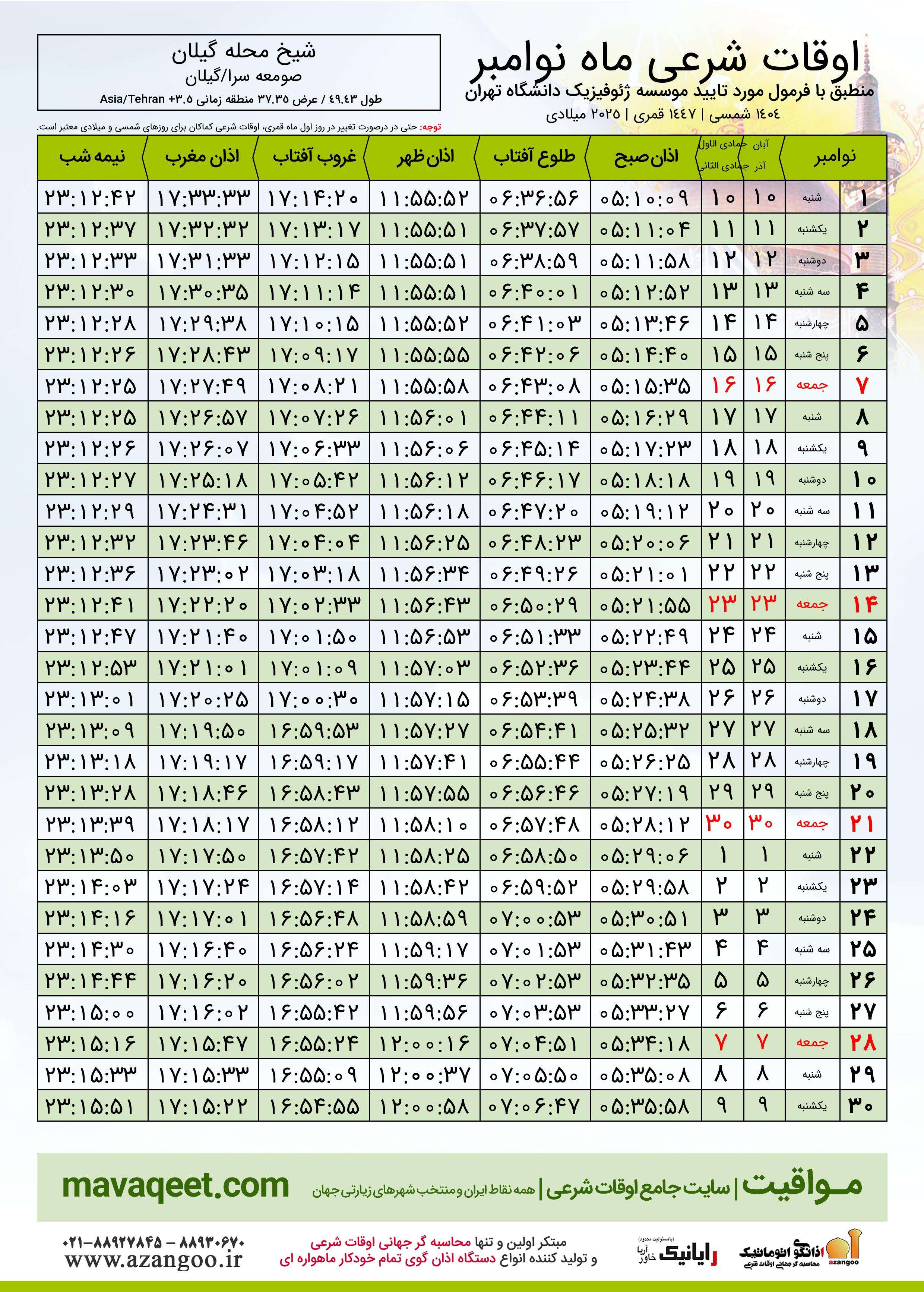 جدول اوقات شرعی نوامبر ٢٠٢٥ میلادی شهر شیخ محله گیلان