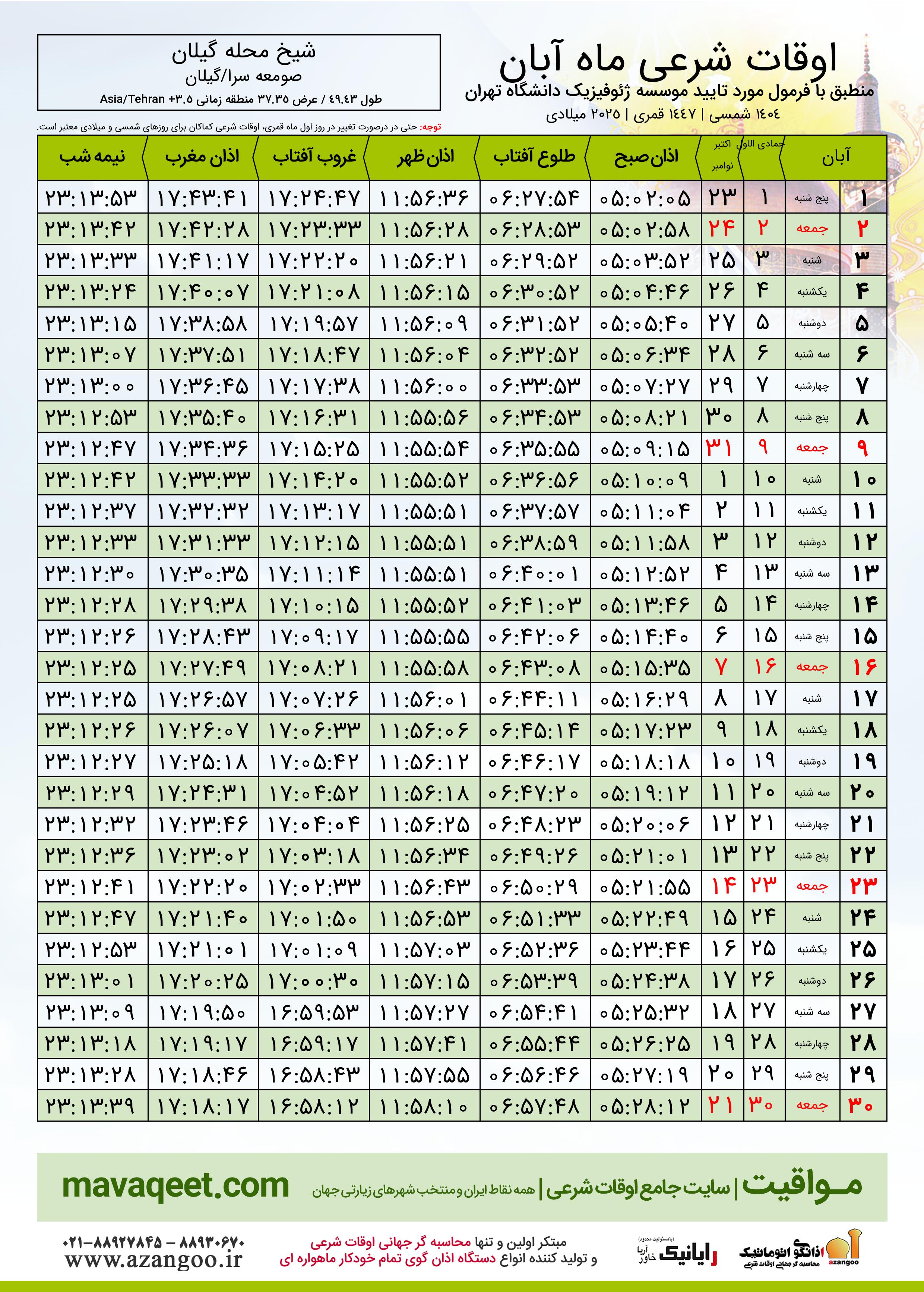 جدول اوقات شرعی آبان ١٤٠٤ شمسی شهر شیخ محله گیلان