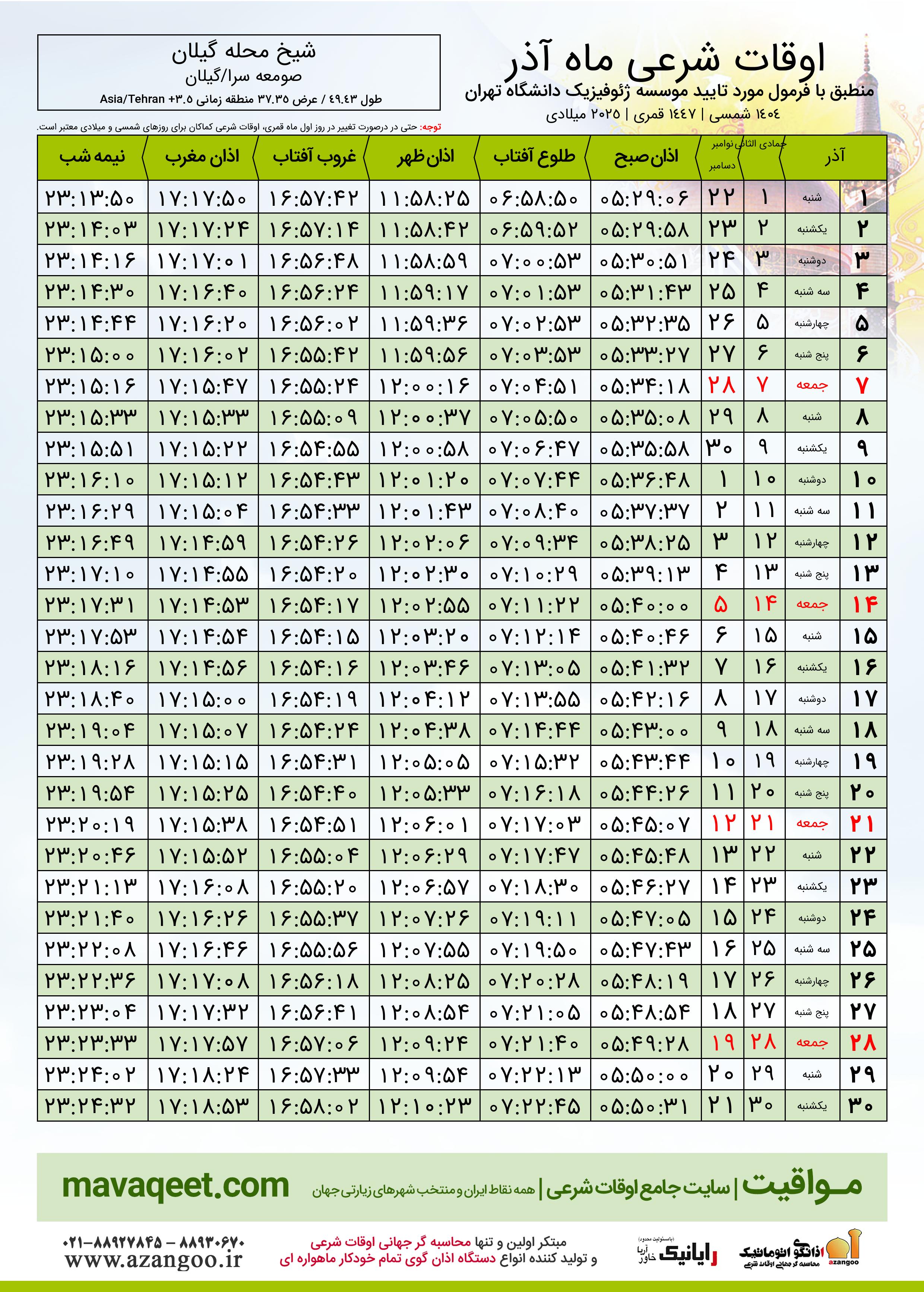 اوقات شرعی آذر ١٤٠٤ شمسی شهر شیخ محله گیلان