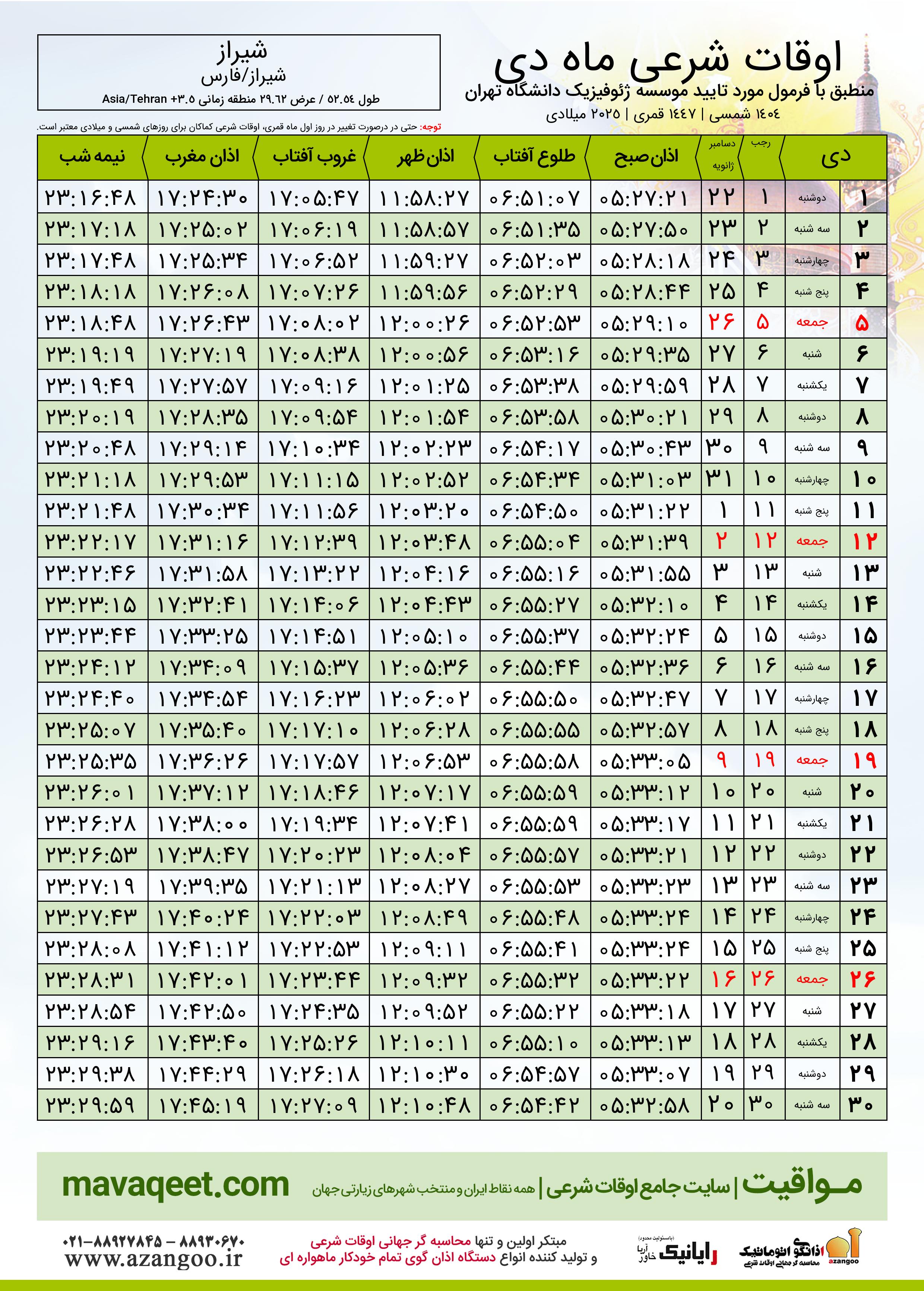 دانلود اوقات شرعی دسامبر ٢٠٢٥ شهر شیراز