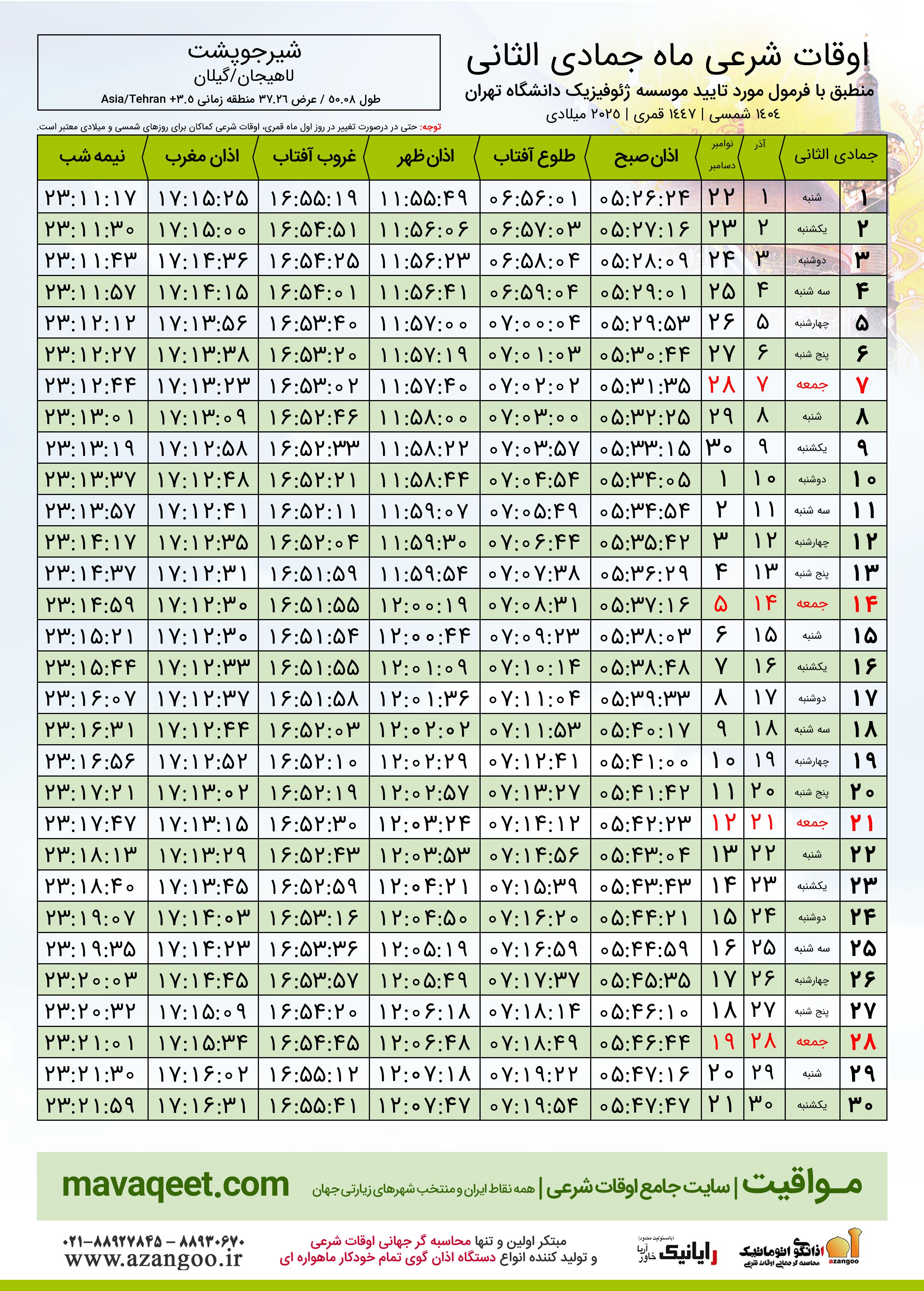 جدول اوقات شرعی جمادی الثانی ١٤٤٧ قمری شهر شیرجوپشت