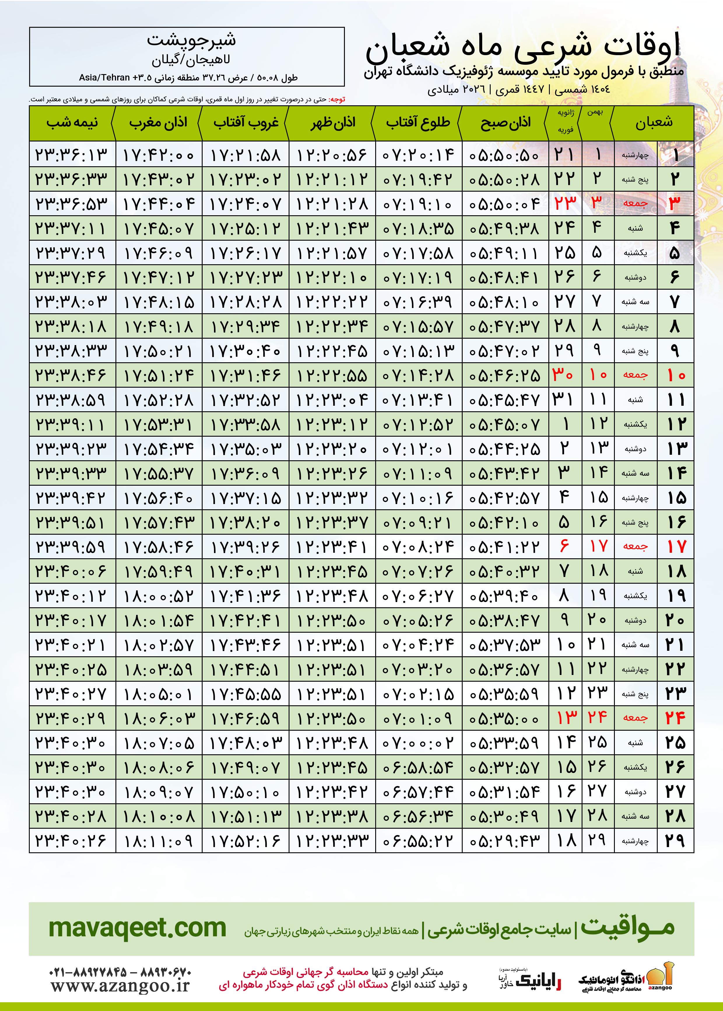اوقات شرعی ماه شعبان ١٤٤٧ هـ.ق شهر شیرجوپشت بر