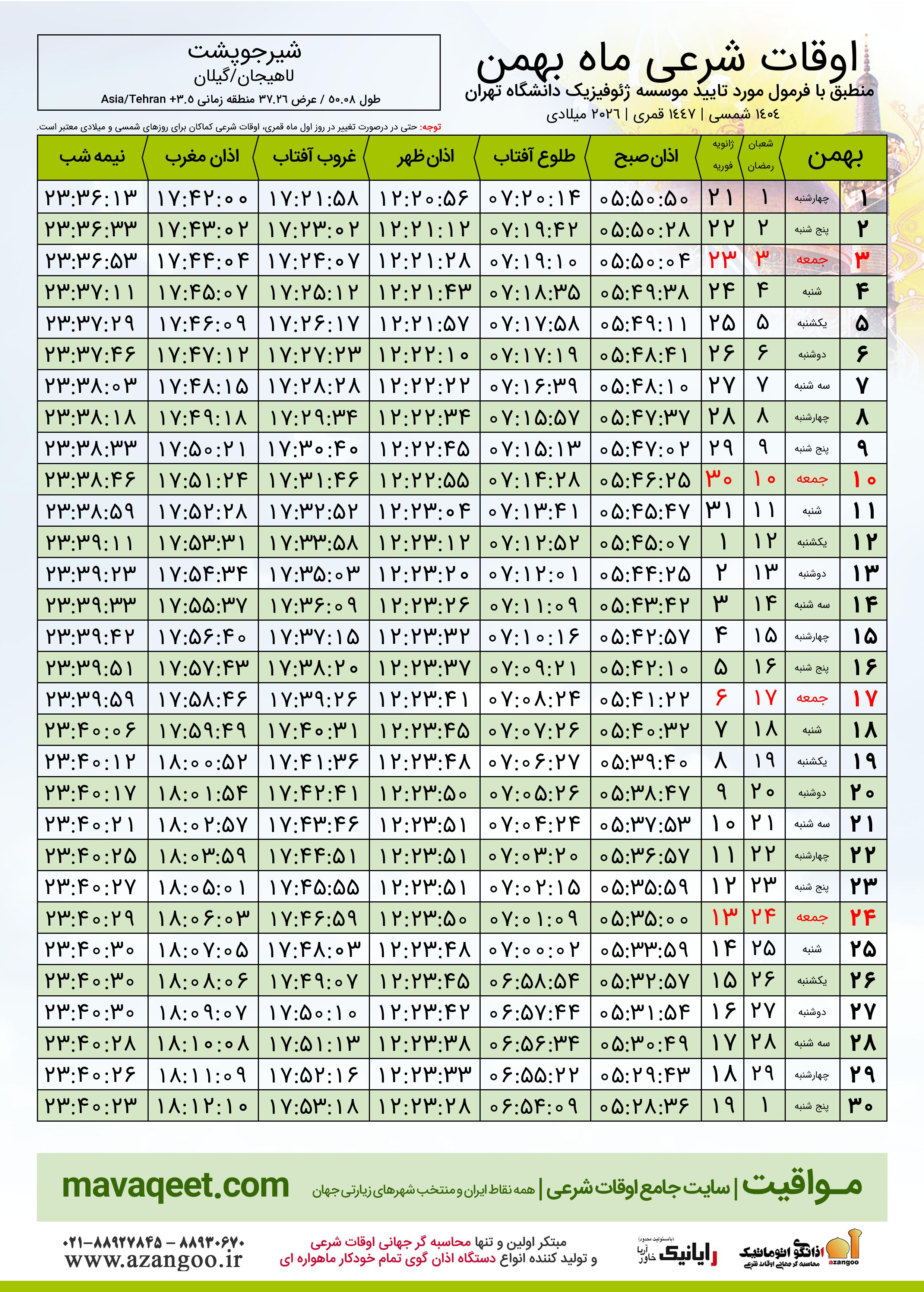 جدول اوقات شرعی بهمن ١٤٠٤ شمسی شهر شیرجوپشت