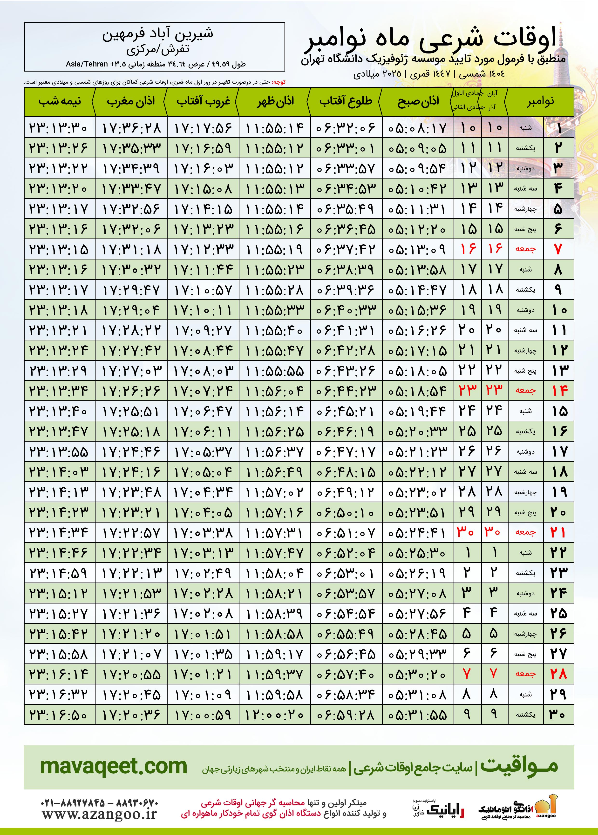 جدول اوقات شرعی نوامبر ٢٠٢٥ میلادی شهر شیرین آباد فرمهین