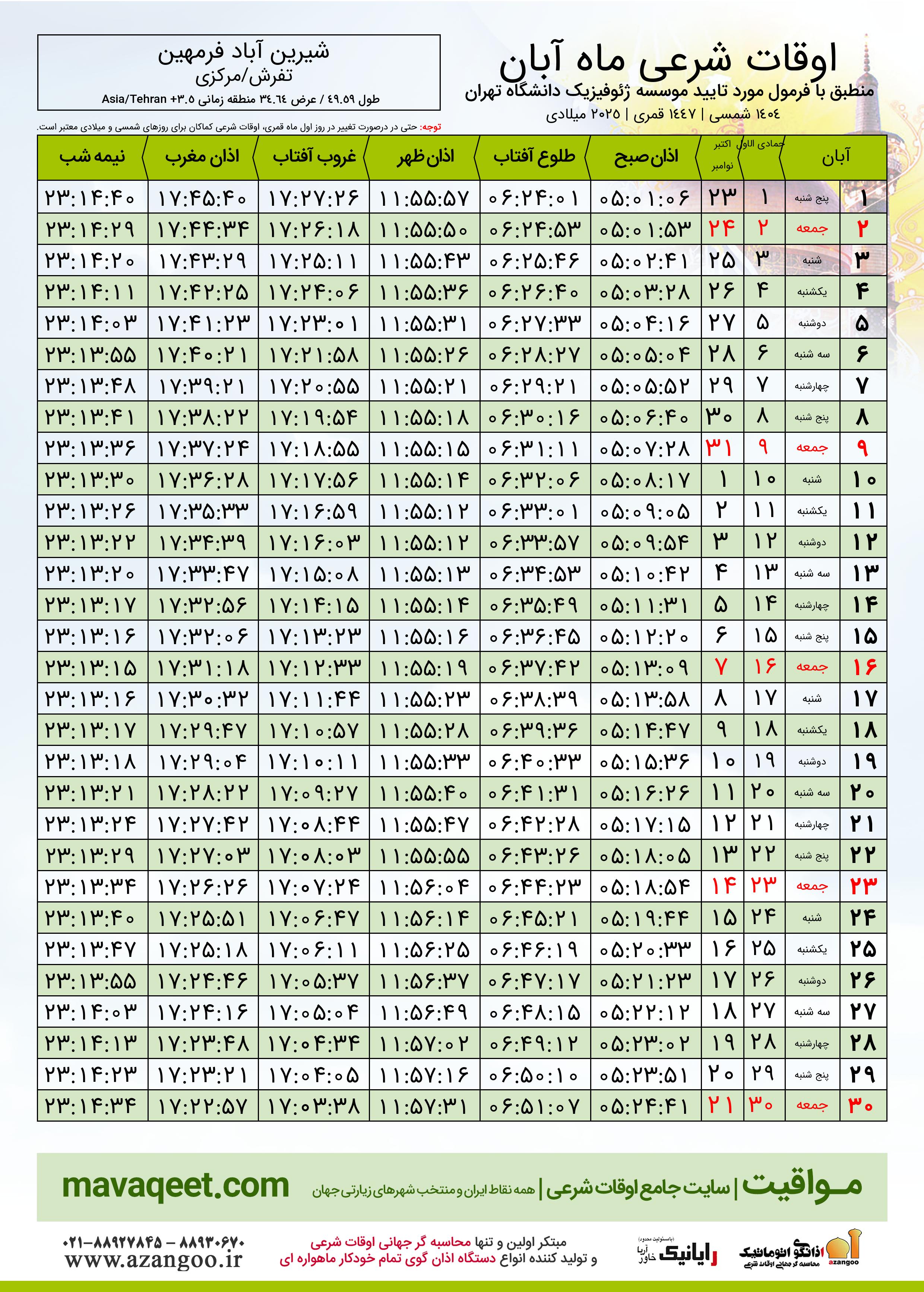 اوقات شرعی آبان ١٤٠٤ شمسی شهر شیرین آباد فرمهین