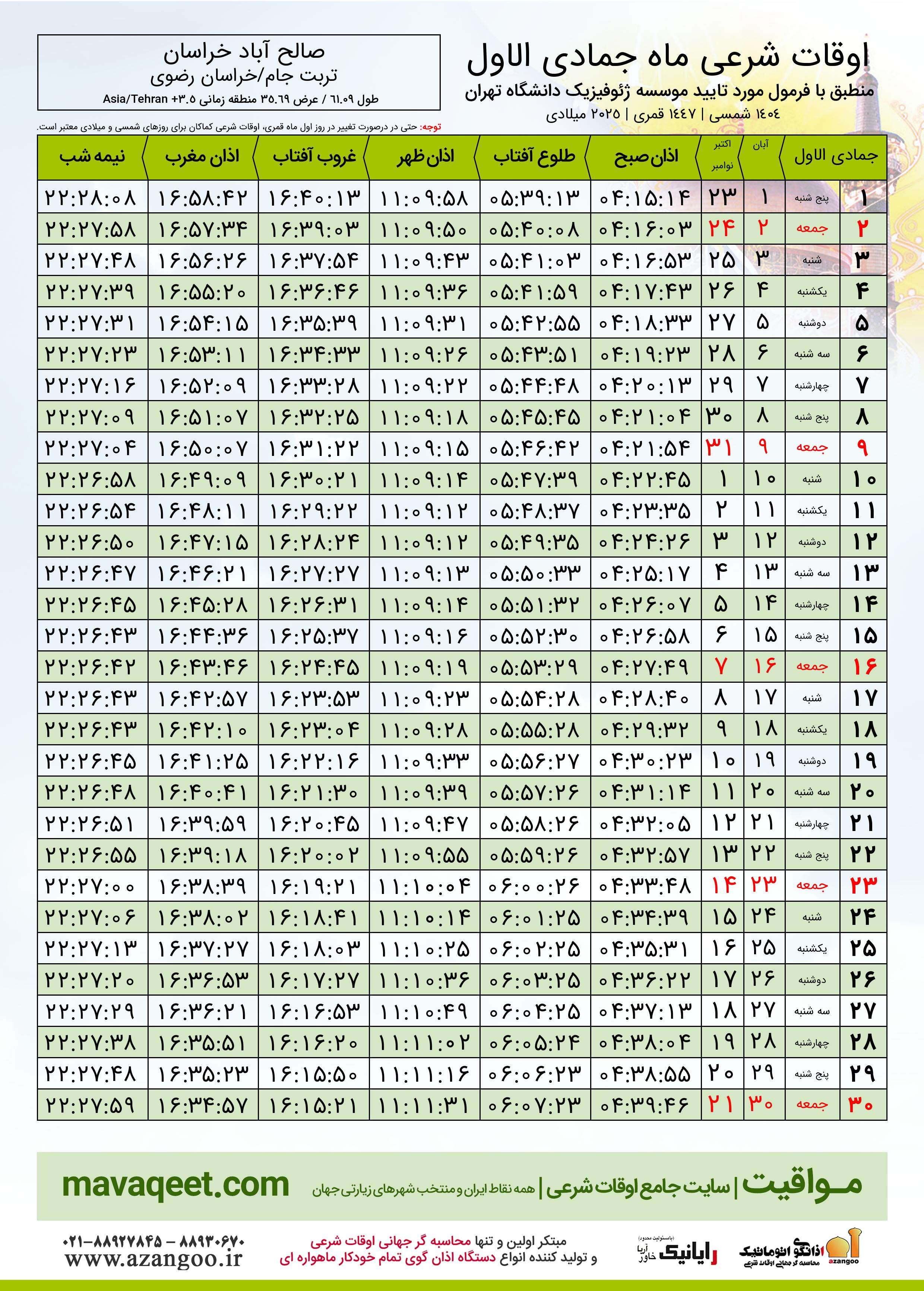 جدول اوقات شرعی جمادی الاول ١٤٤٧ قمری شهر صالح آباد خراسان