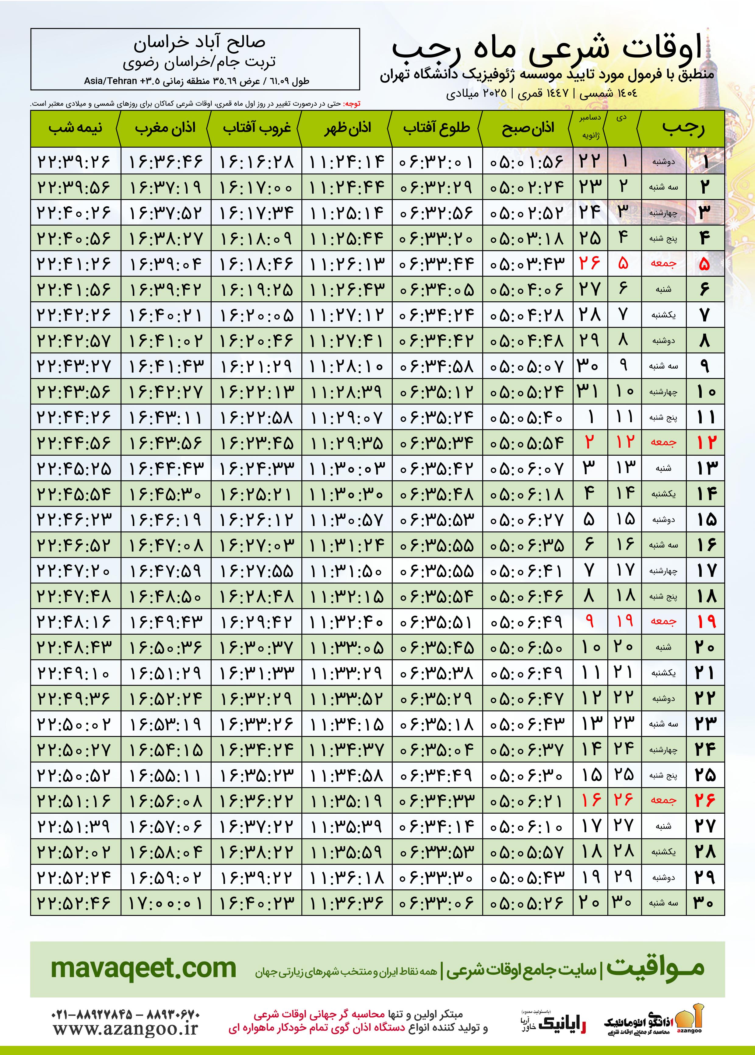 اوقات شرعی ماه رجب ١٤٤٧ هـ.ق شهر صالح آباد خراسان بر