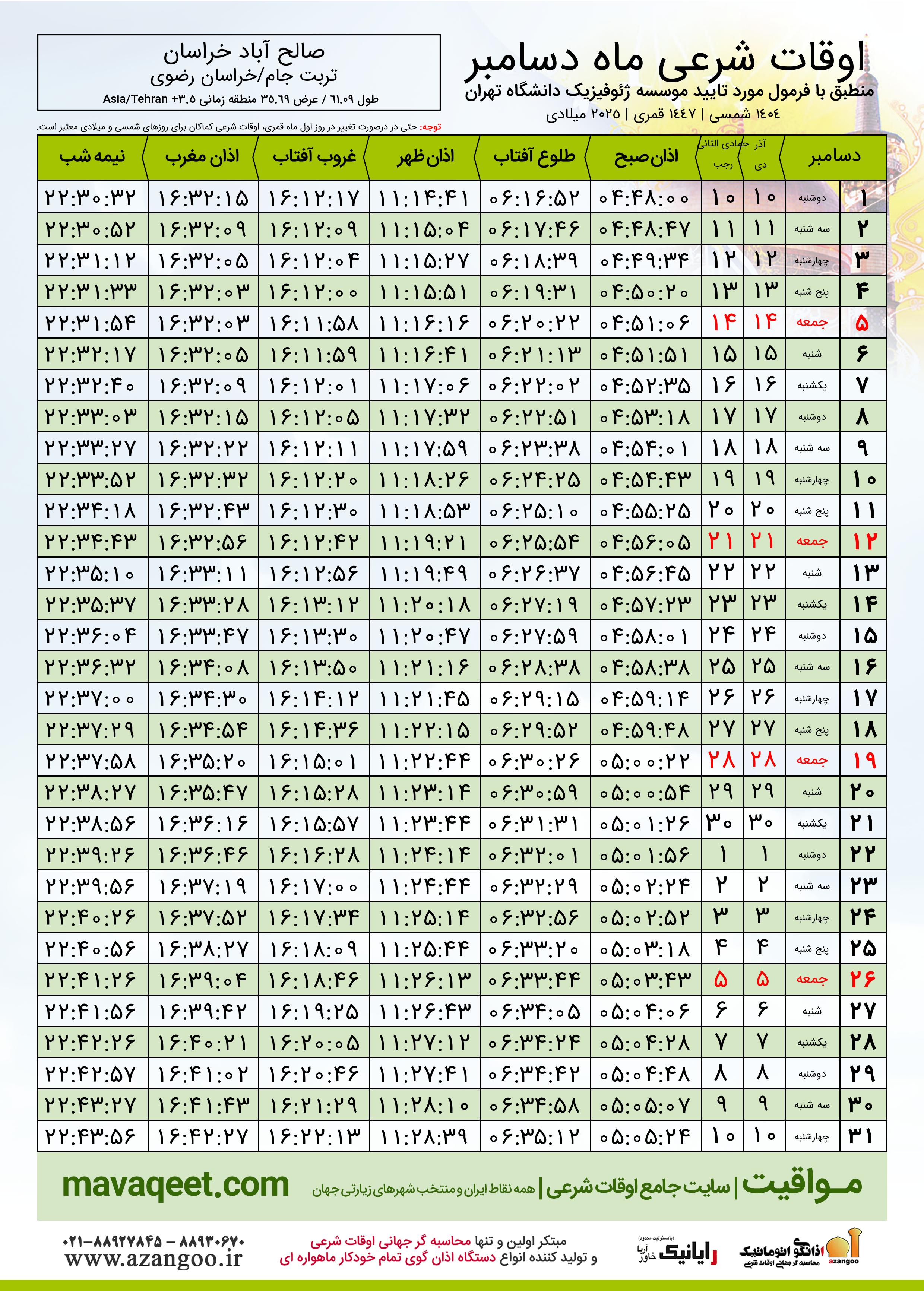 جدول اوقات شرعی دسامبر ٢٠٢٥ میلادی شهر صالح آباد خراسان