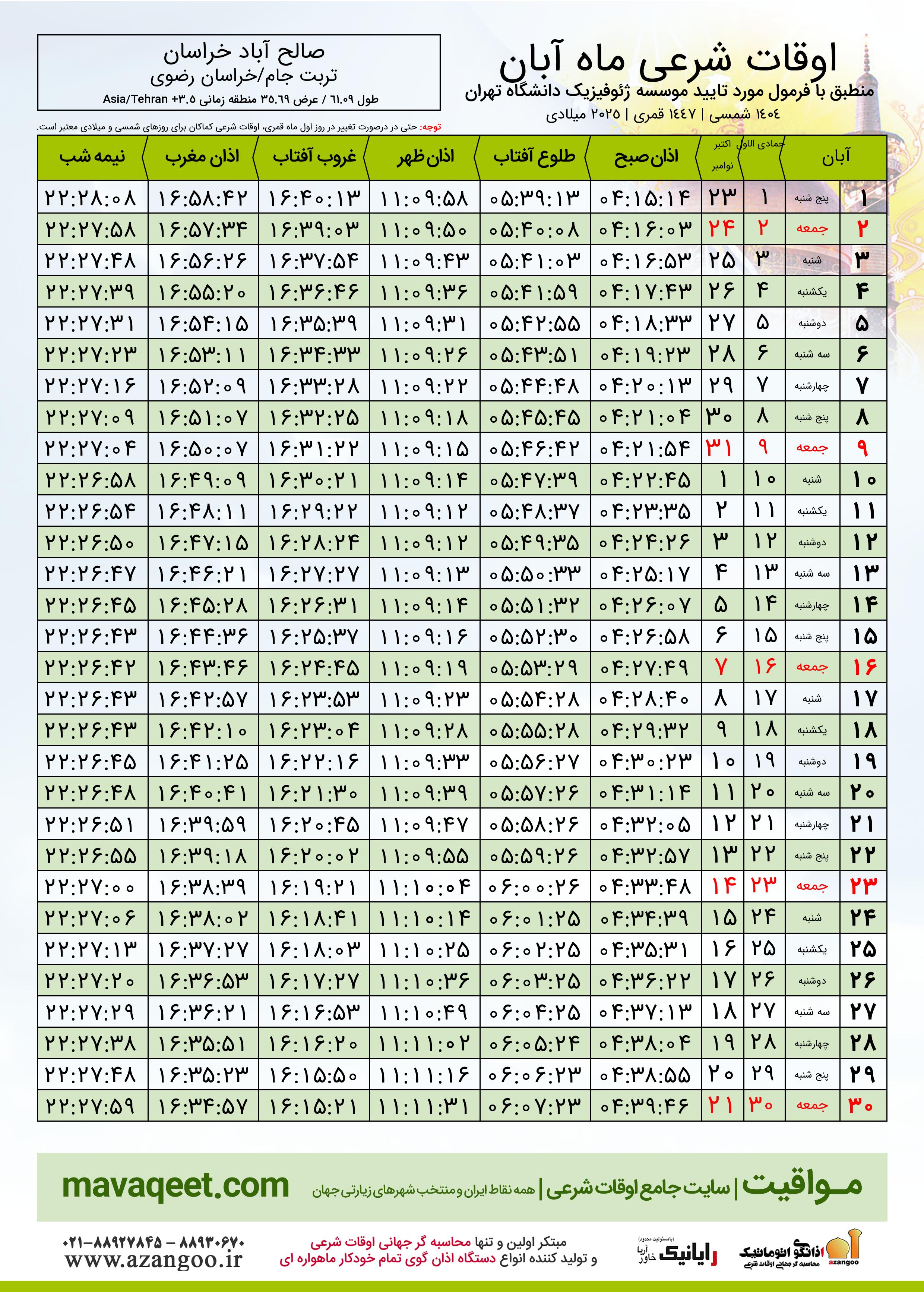 اوقات شرعی آبان ١٤٠٤ شمسی شهر صالح آباد خراسان