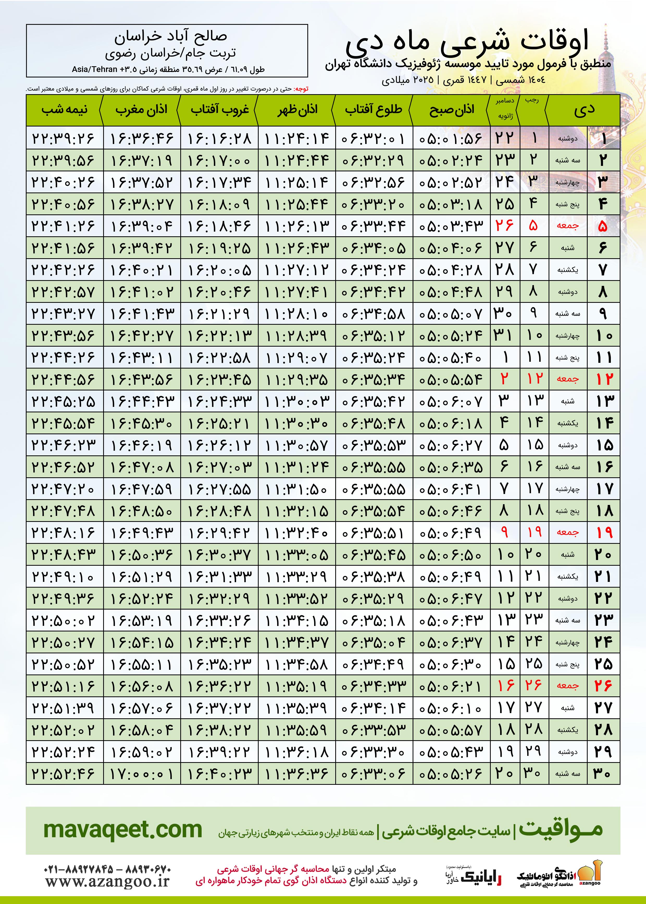 اوقات شرعی دی ١٤٠٤ شمسی شهر صالح آباد خراسان