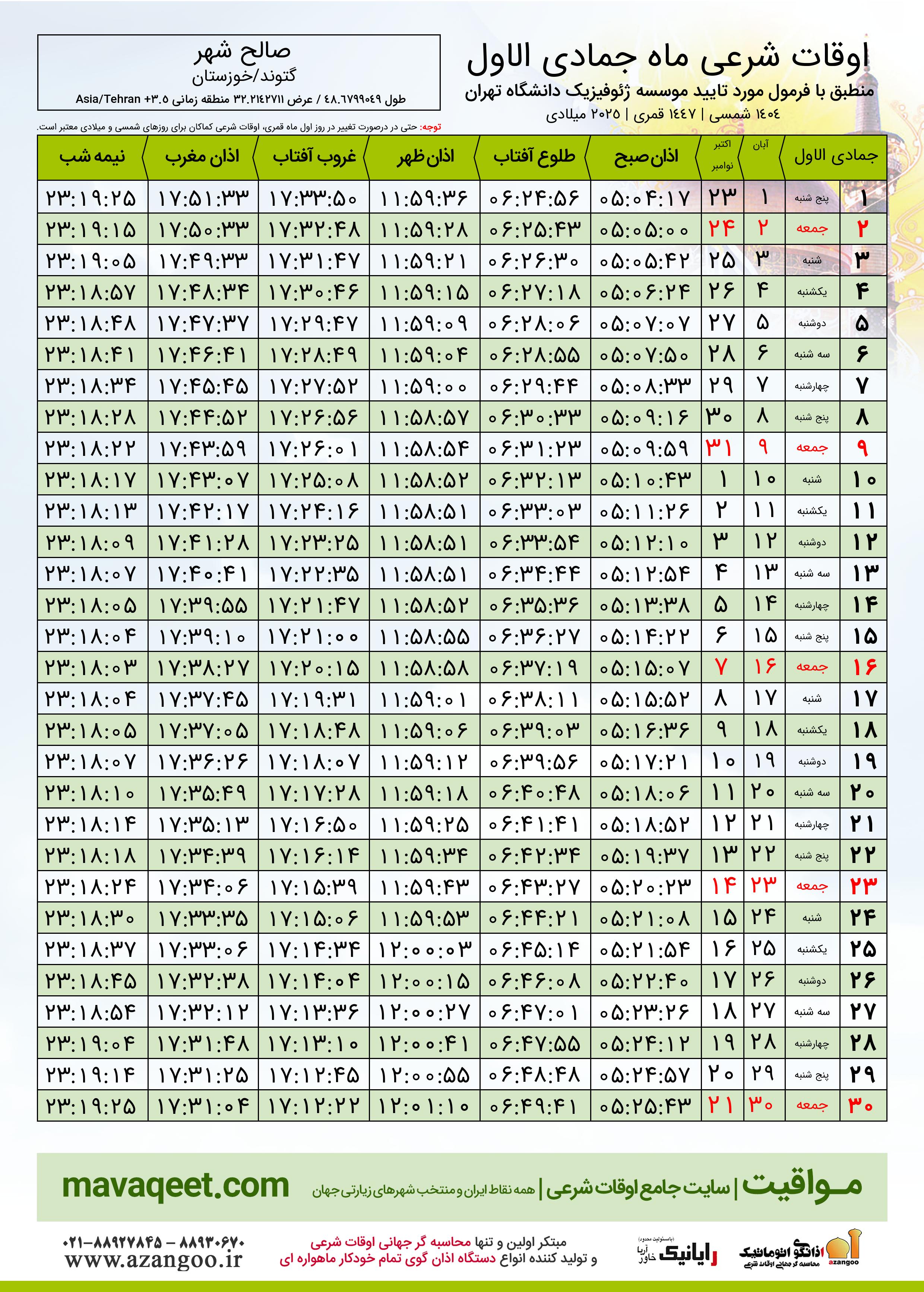 اوقات شرعی ماه جمادی الاول ١٤٤٧ هـ.ق شهر صالح شهر بر