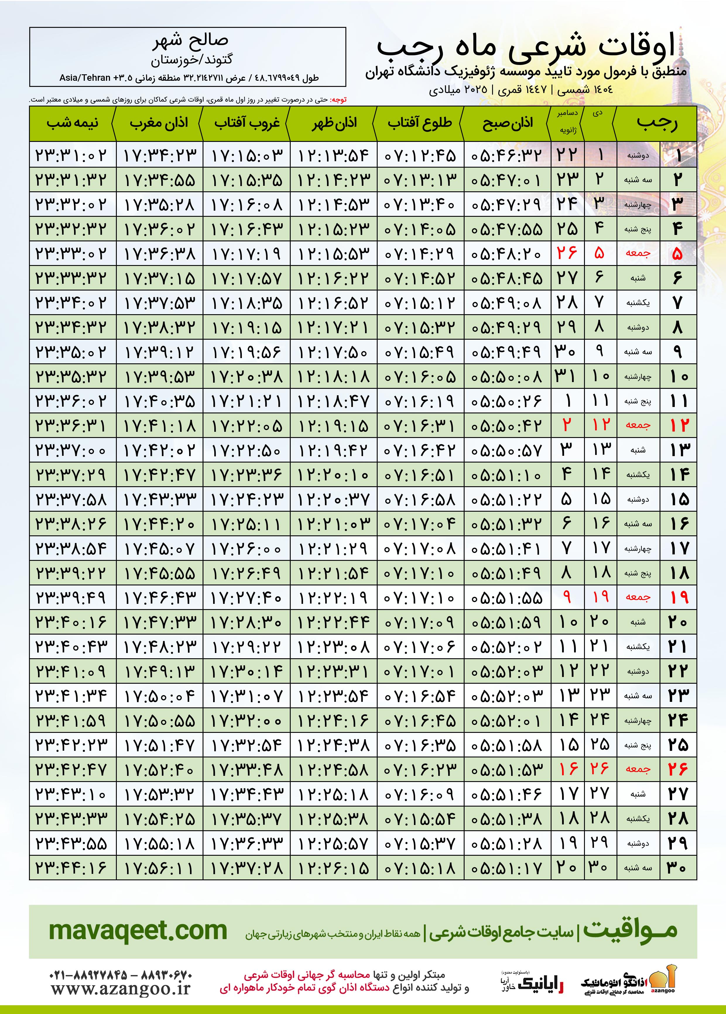 اوقات شرعی ماه رجب ١٤٤٧ هـ.ق شهر صالح شهر بر
