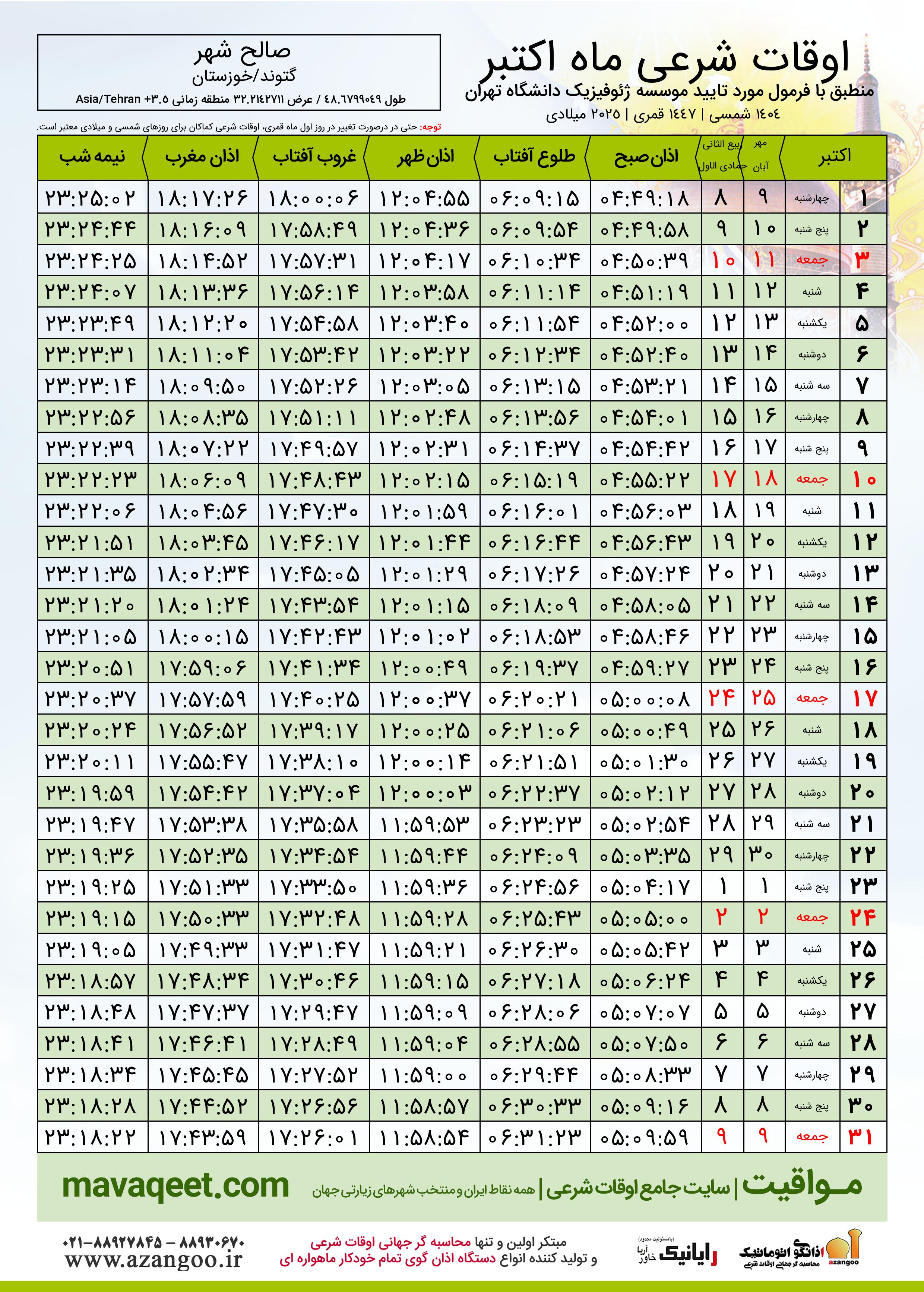 جدول اوقات شرعی اکتبر ٢٠٢٥ میلادی شهر صالح شهر