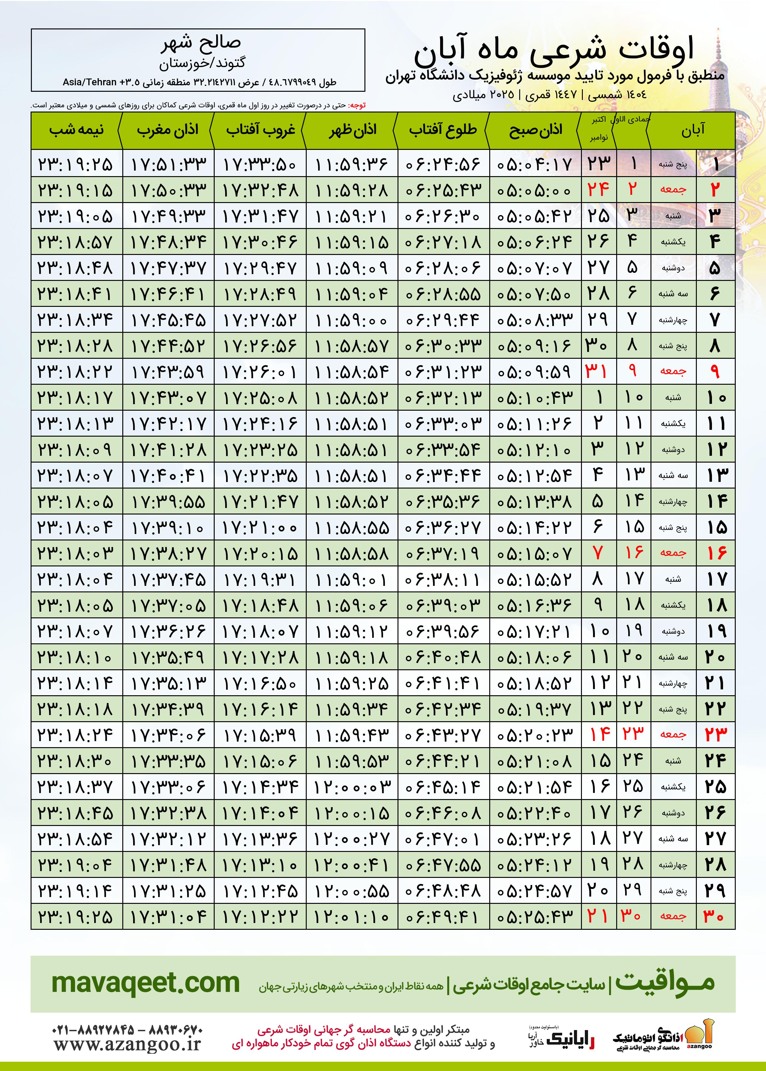اوقات شرعی آبان ١٤٠٤ شمسی شهر صالح شهر