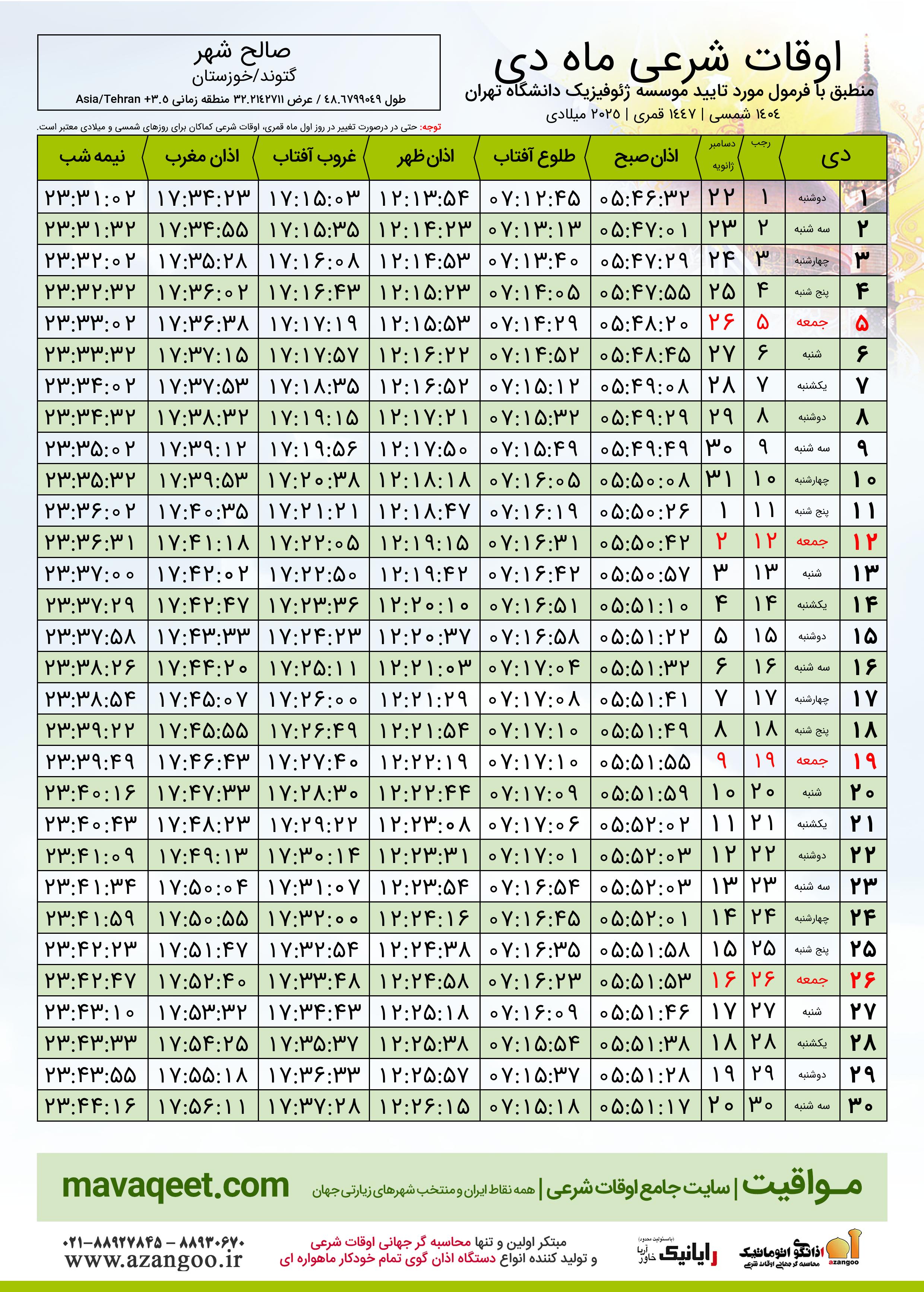 اوقات شرعی دی ١٤٠٤ شمسی شهر صالح شهر