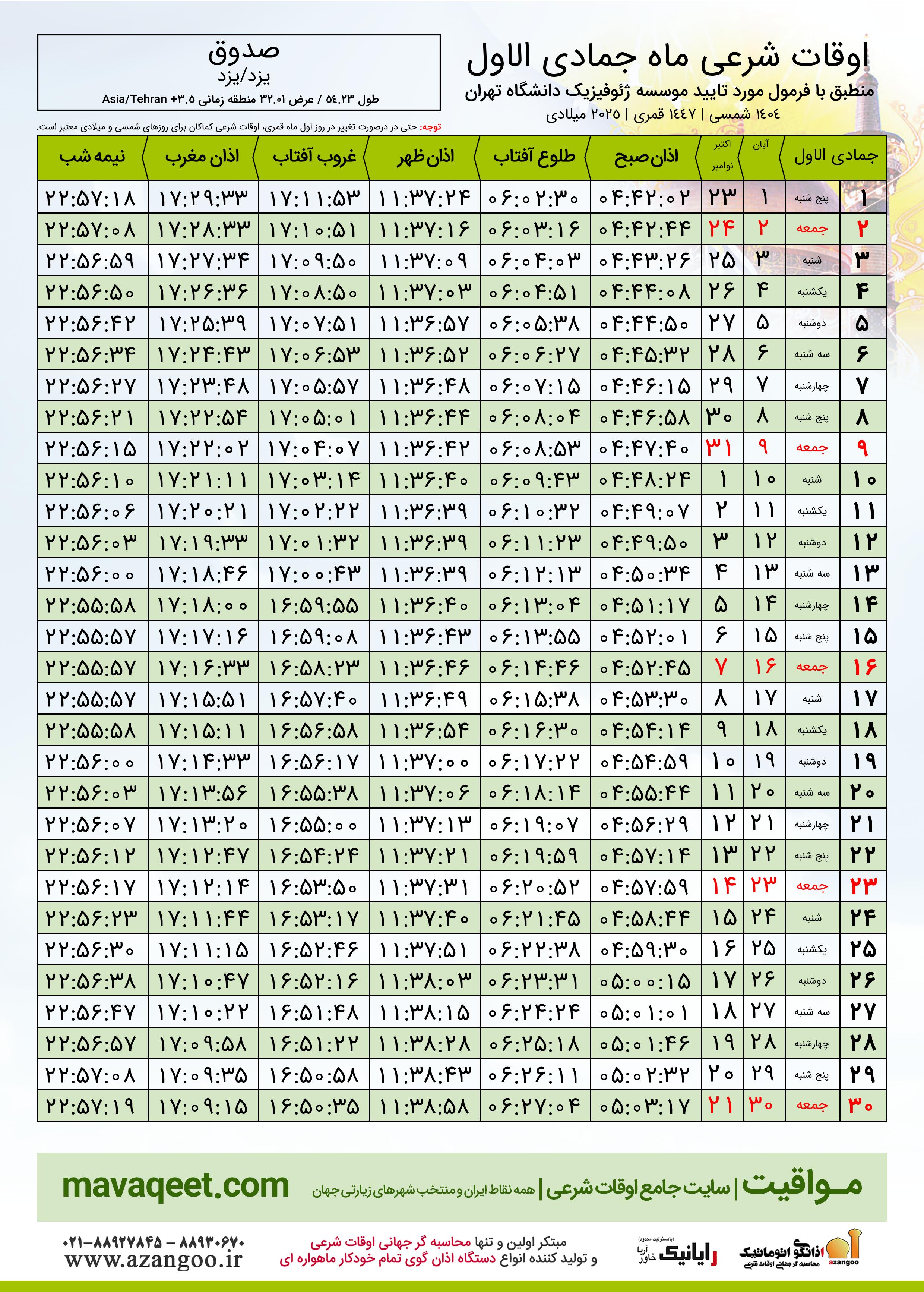اوقات شرعی ماه جمادی الاول ١٤٤٧ هـ.ق شهر صدوق بر