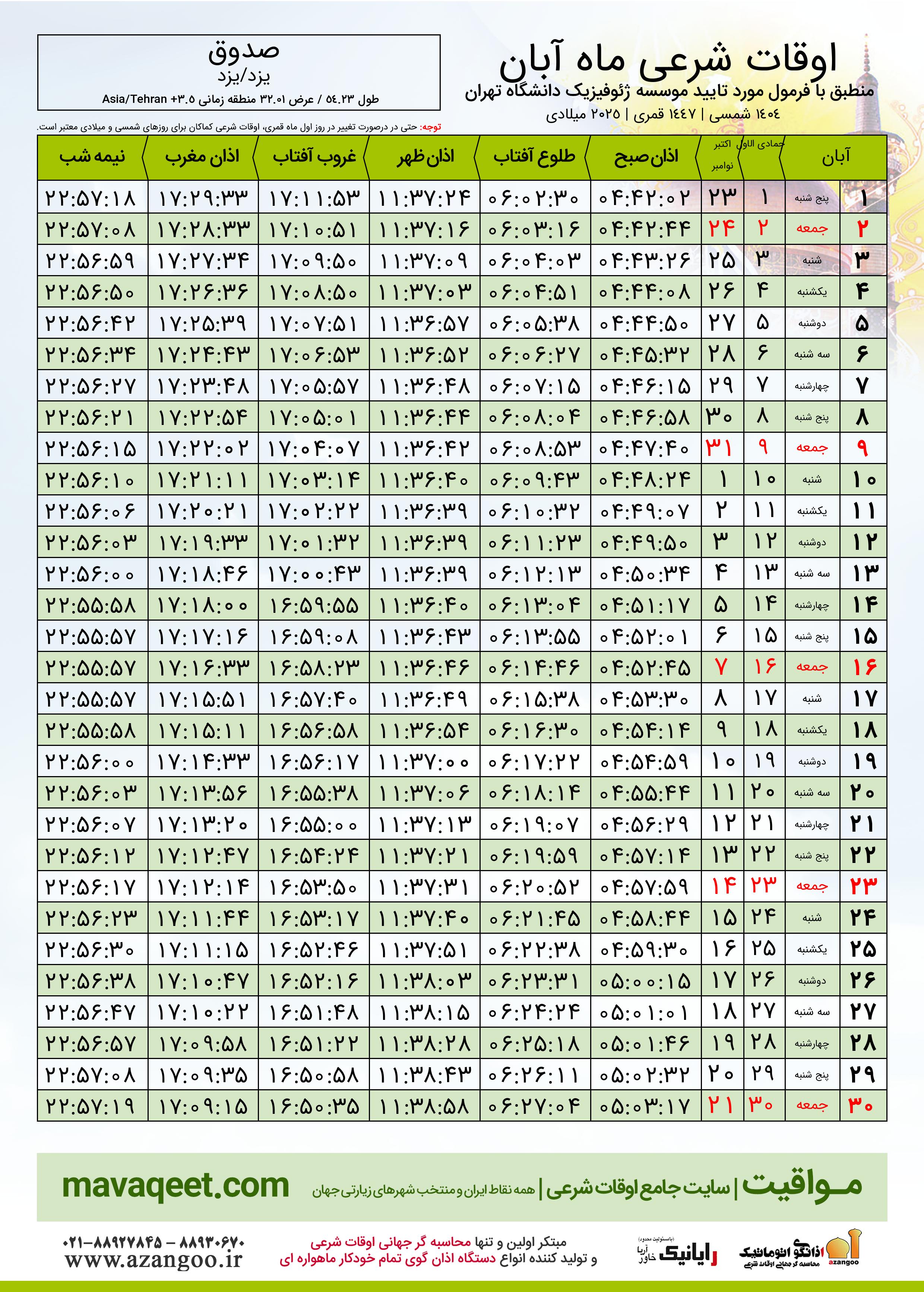 جدول اوقات شرعی آبان ١٤٠٤ شمسی شهر صدوق