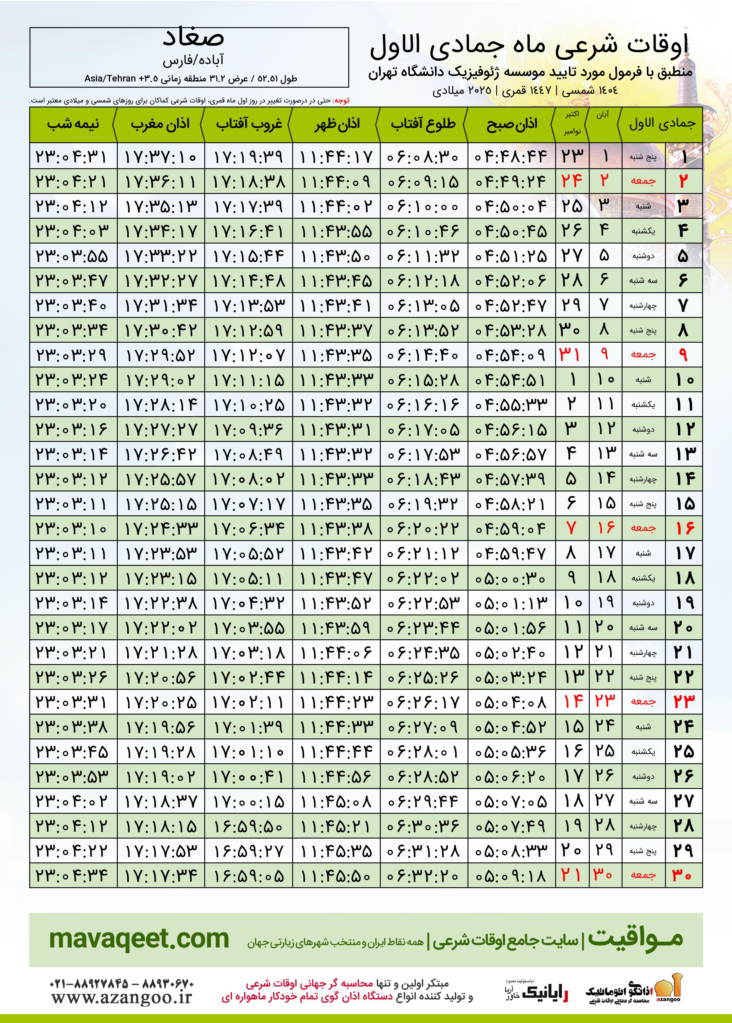 جهت نمایش تصویر جدول اوقات شرعی ماه جمادی الاول ١٤٤٧ هـ.ق شهر صغاد در اندازه