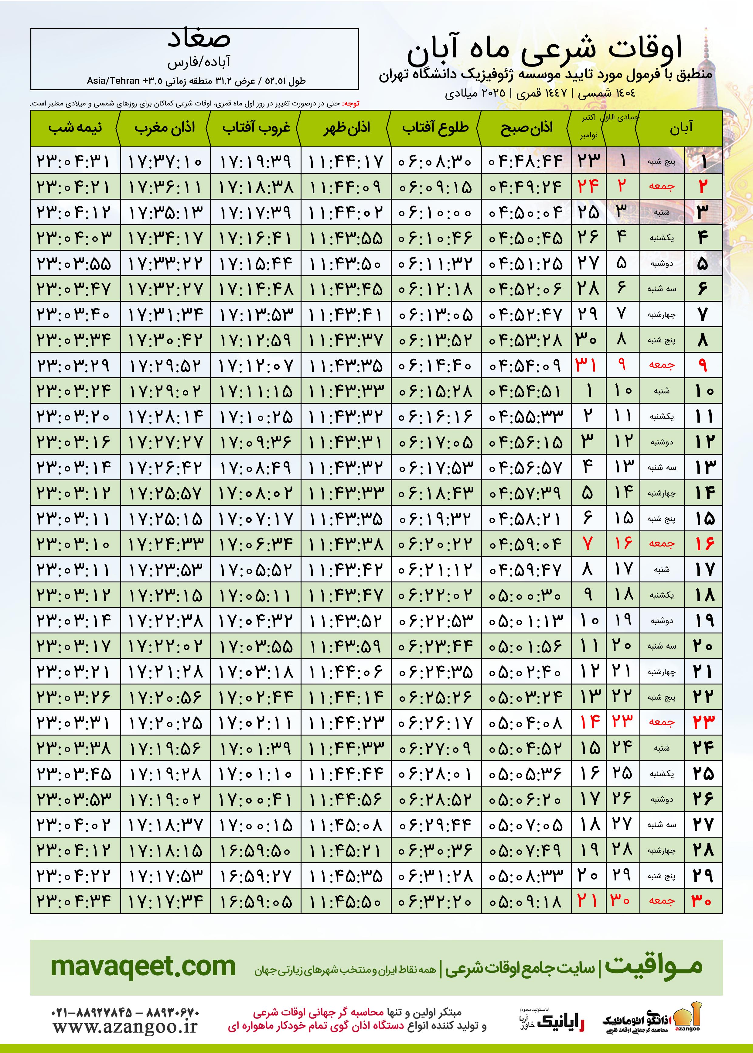 اوقات شرعی آبان ١٤٠٤ شمسی شهر صغاد