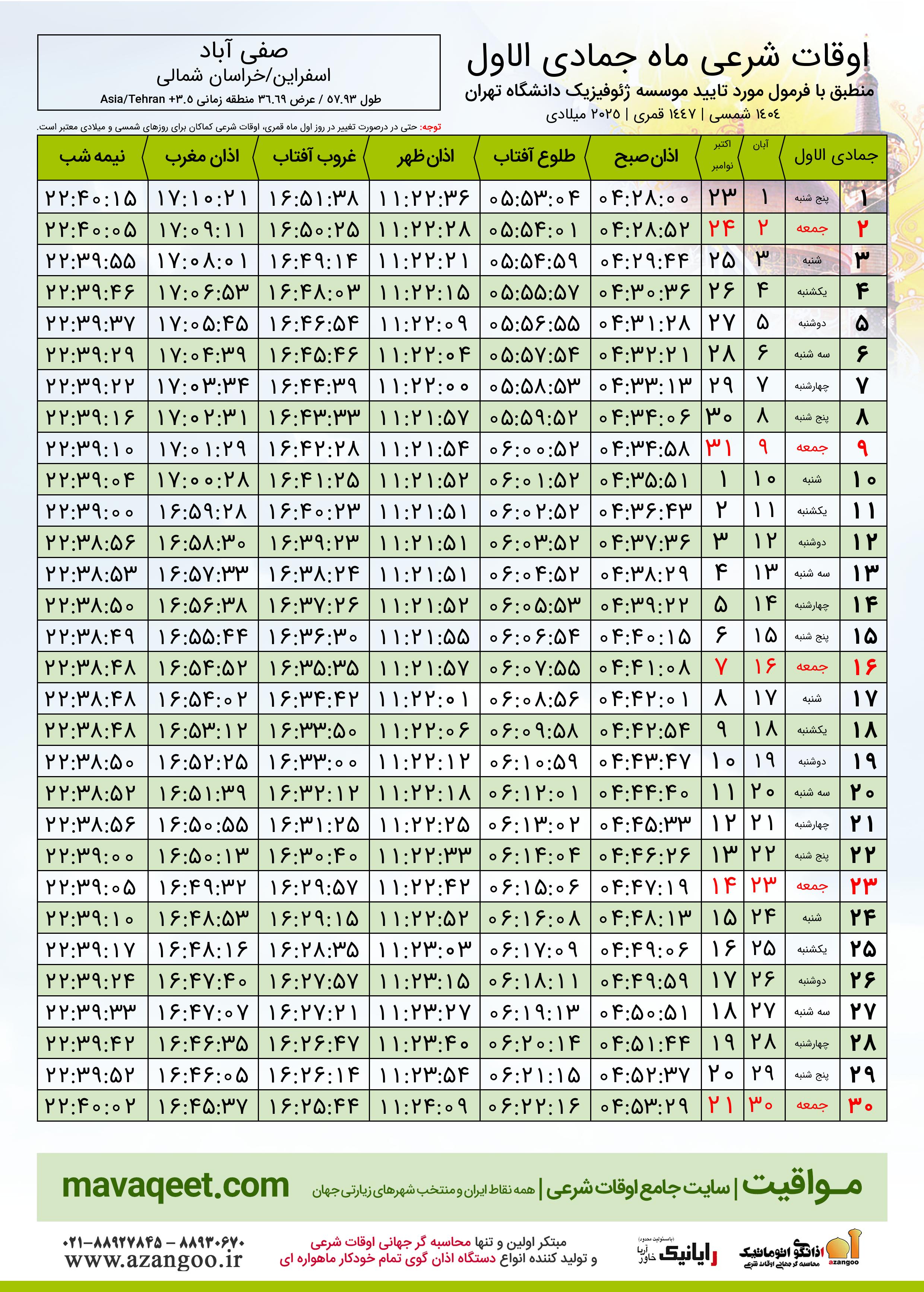 جدول اوقات شرعی جمادی الاول ١٤٤٧ قمری شهر صفی آباد