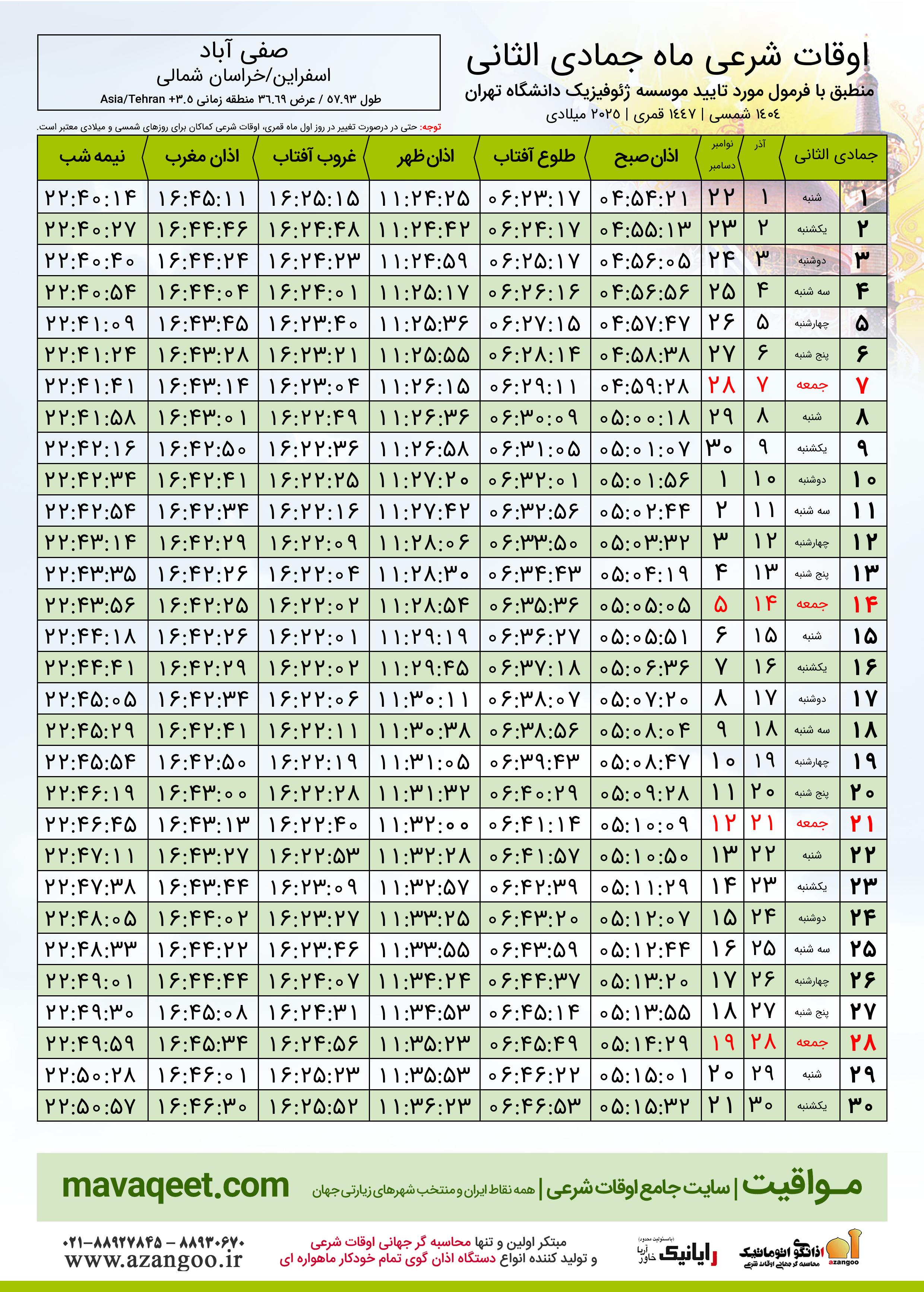 جدول اوقات شرعی جمادی الثانی ١٤٤٧ قمری شهر صفی آباد