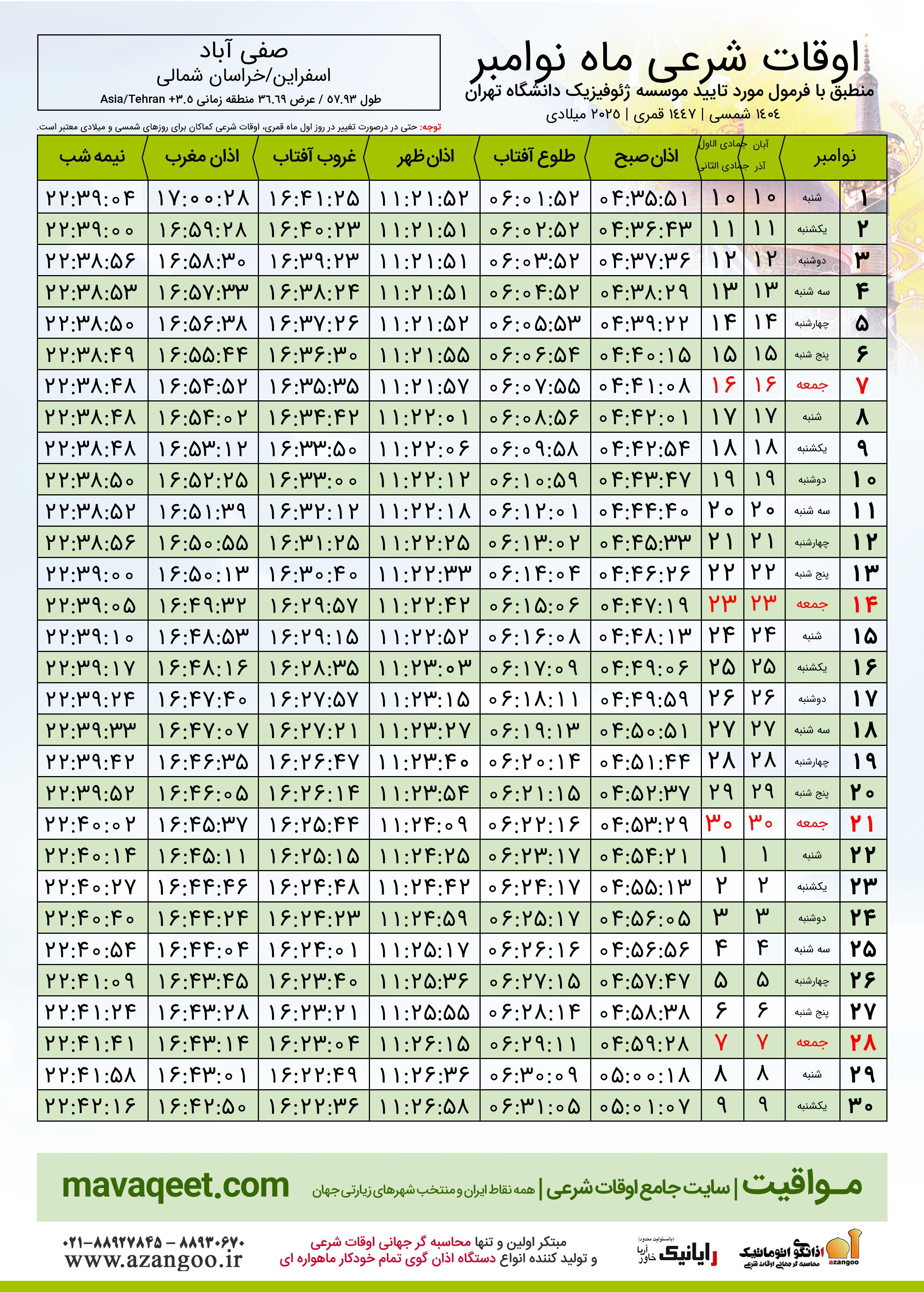 جدول اوقات شرعی نوامبر ٢٠٢٥ میلادی شهر صفی آباد