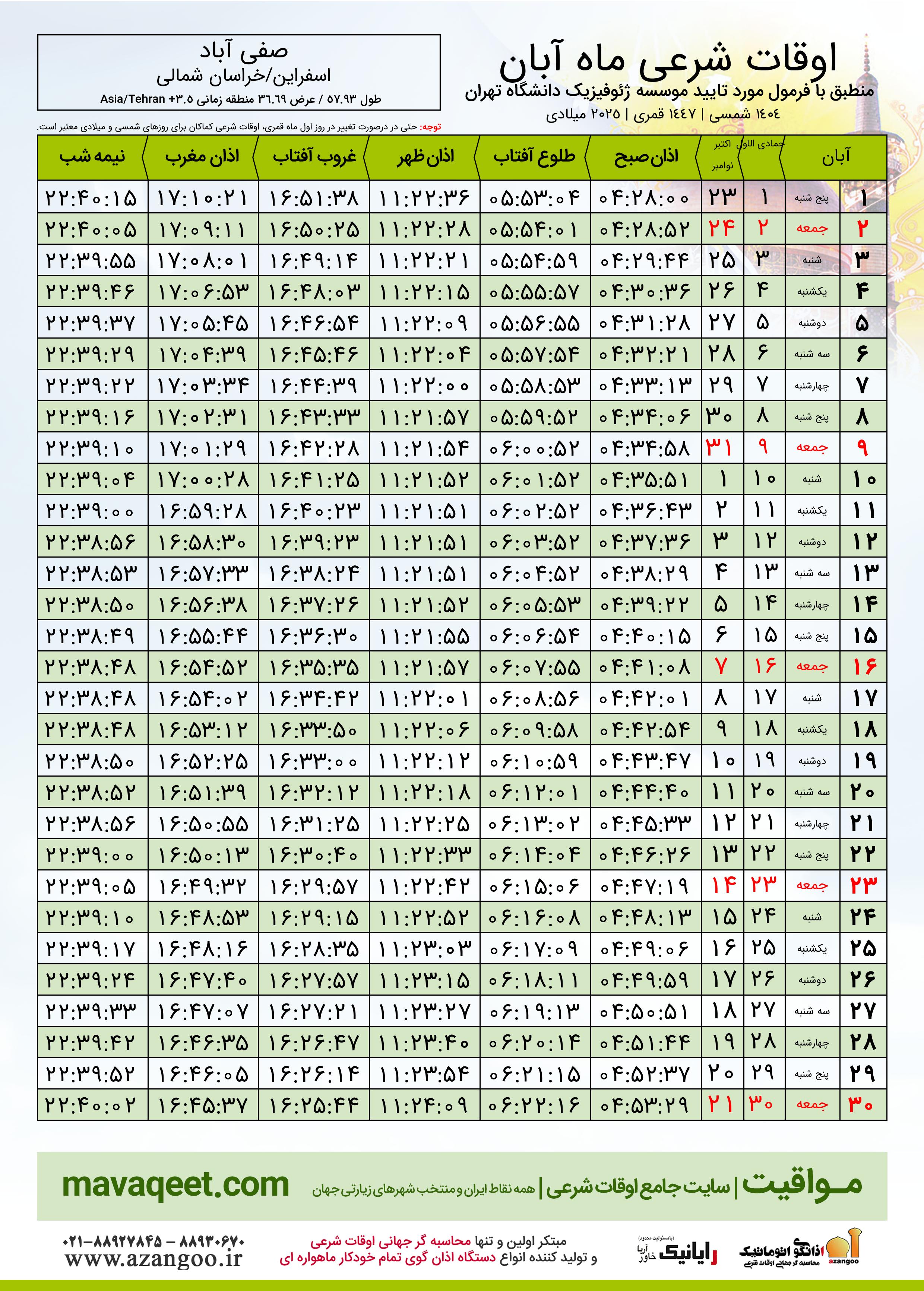 جدول اوقات شرعی آبان ١٤٠٤ شمسی شهر صفی آباد