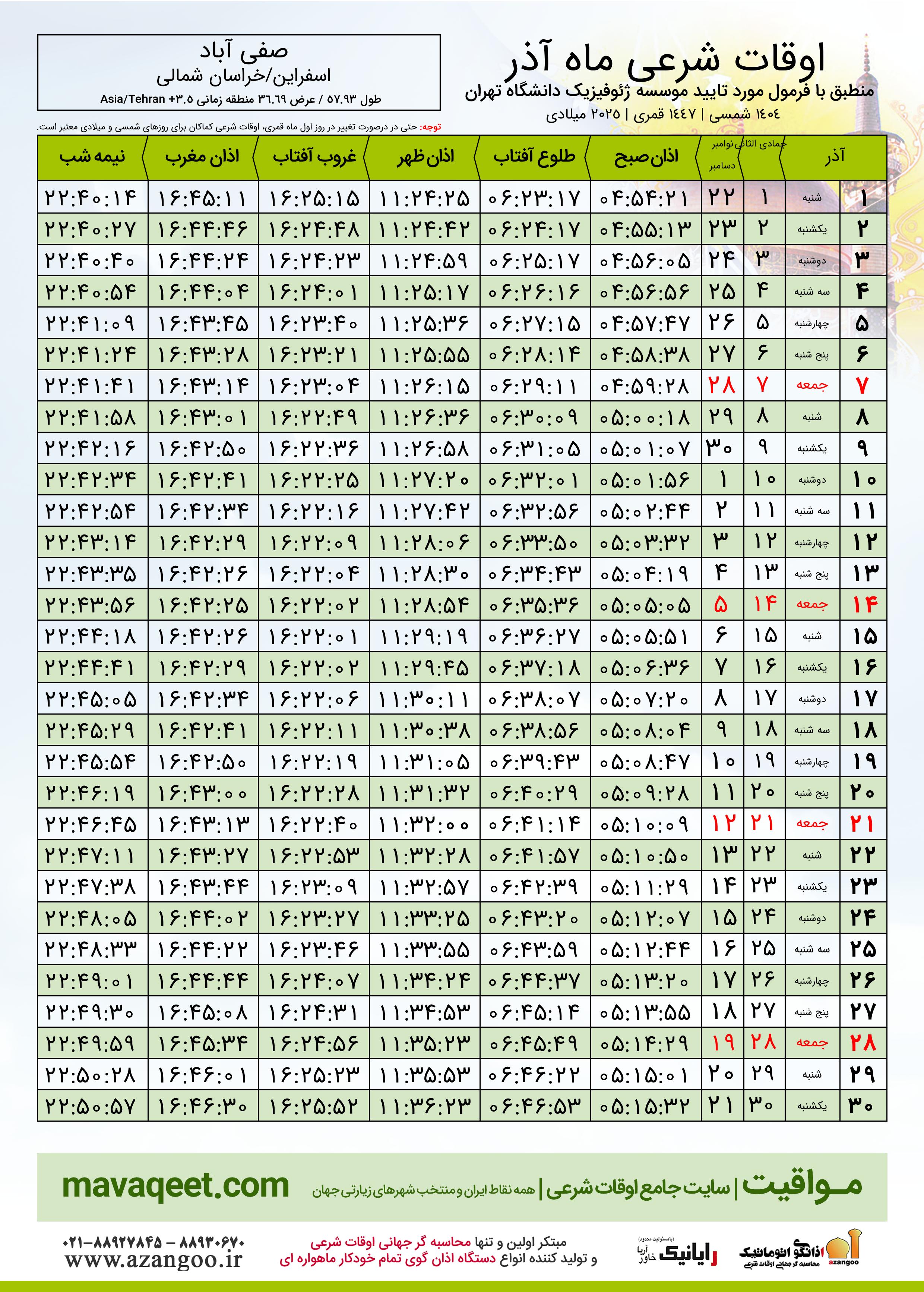 جدول اوقات شرعی آذر ١٤٠٤ شمسی شهر صفی آباد