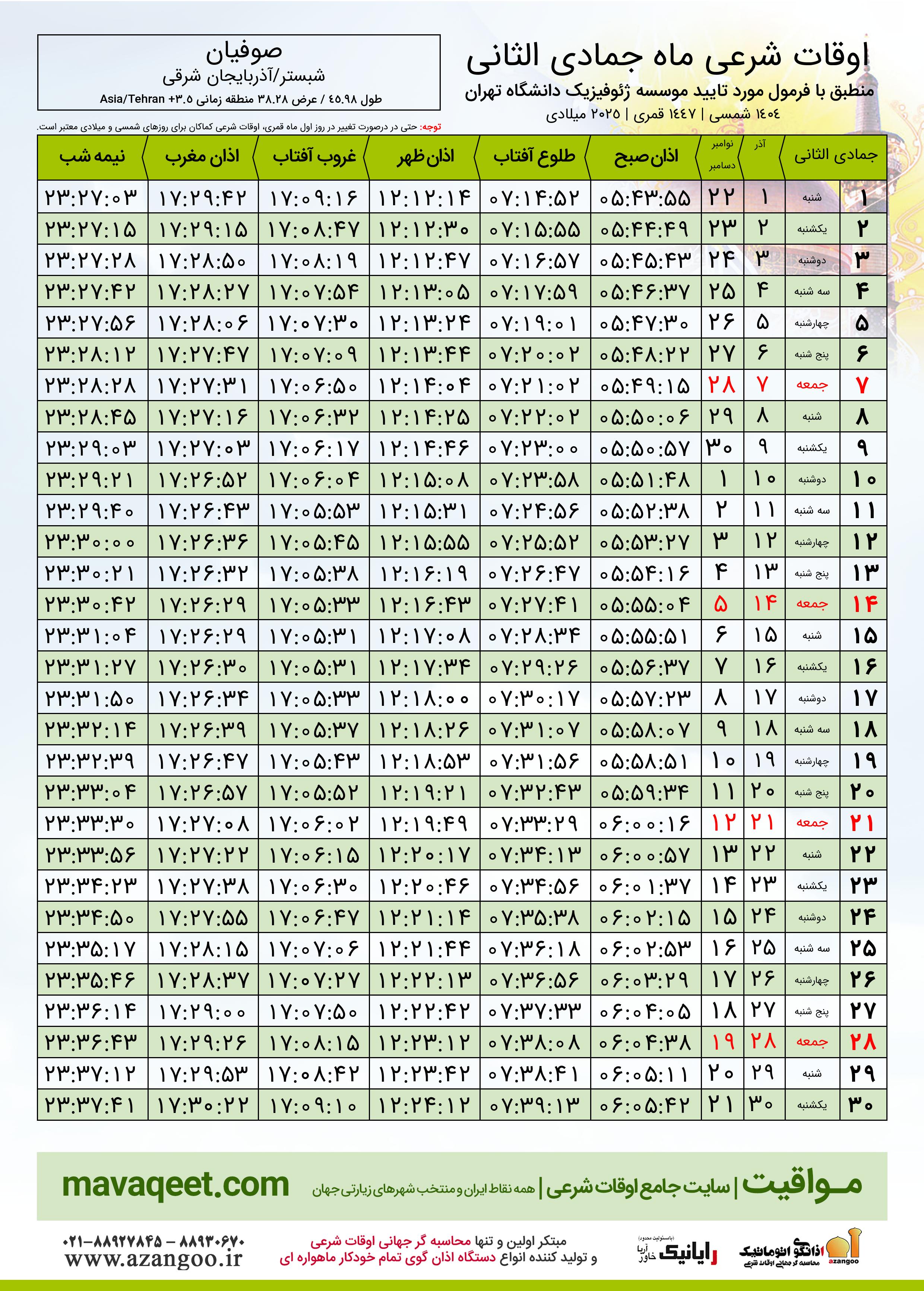 اوقات شرعی ماه جمادی الثانی ١٤٤٧ هـ.ق شهر صوفیان بر