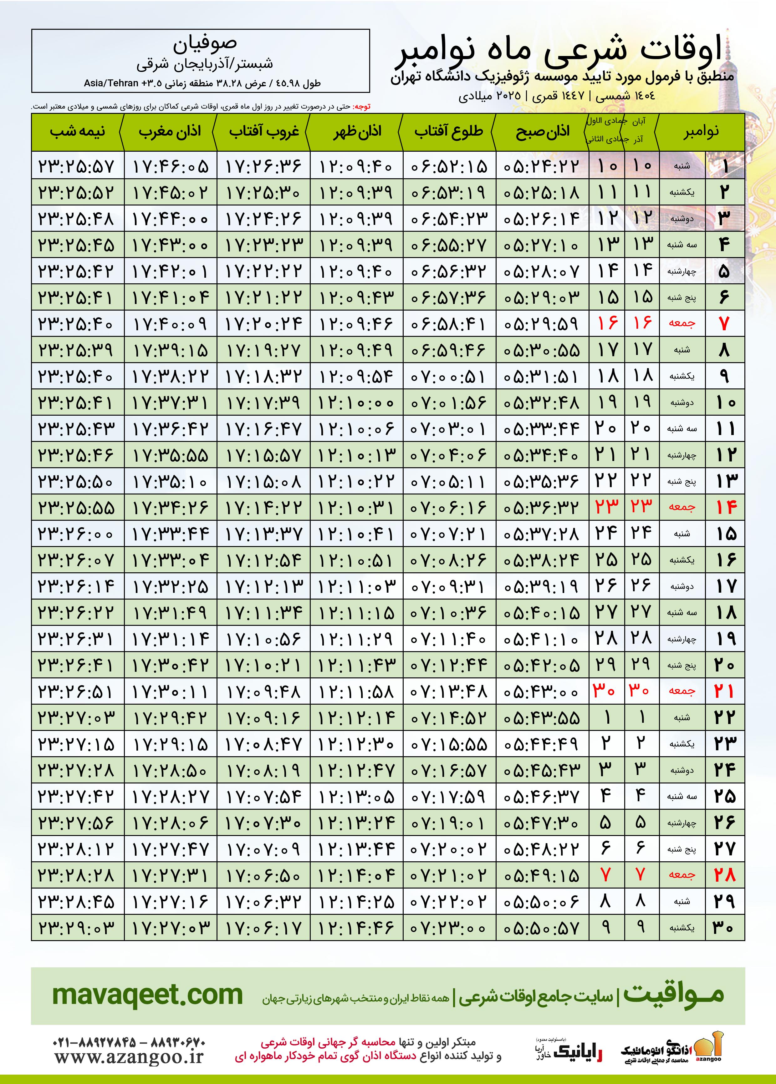 جدول اوقات شرعی نوامبر ٢٠٢٥ میلادی شهر صوفیان