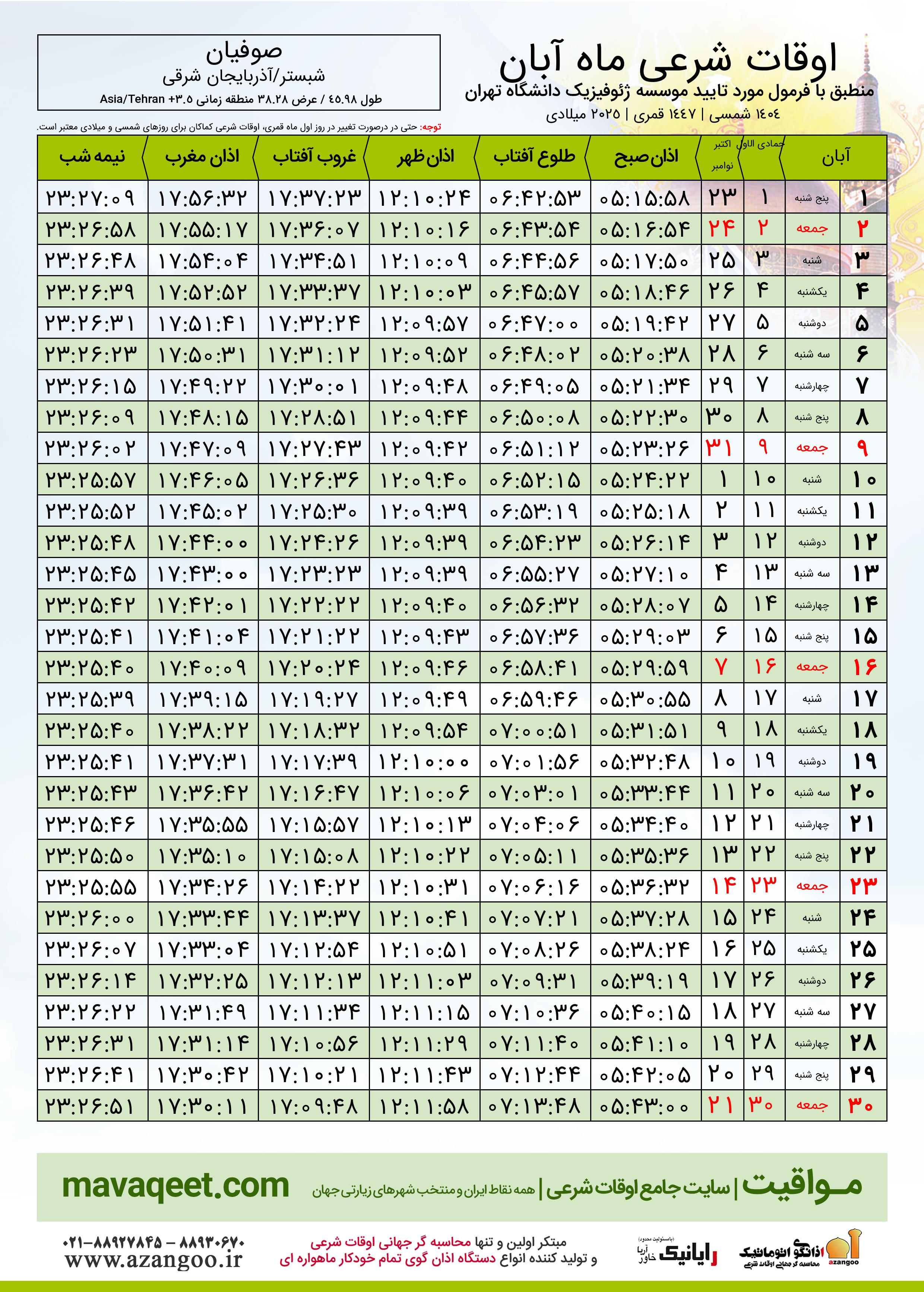 جدول اوقات شرعی آبان ١٤٠٤ شمسی شهر صوفیان