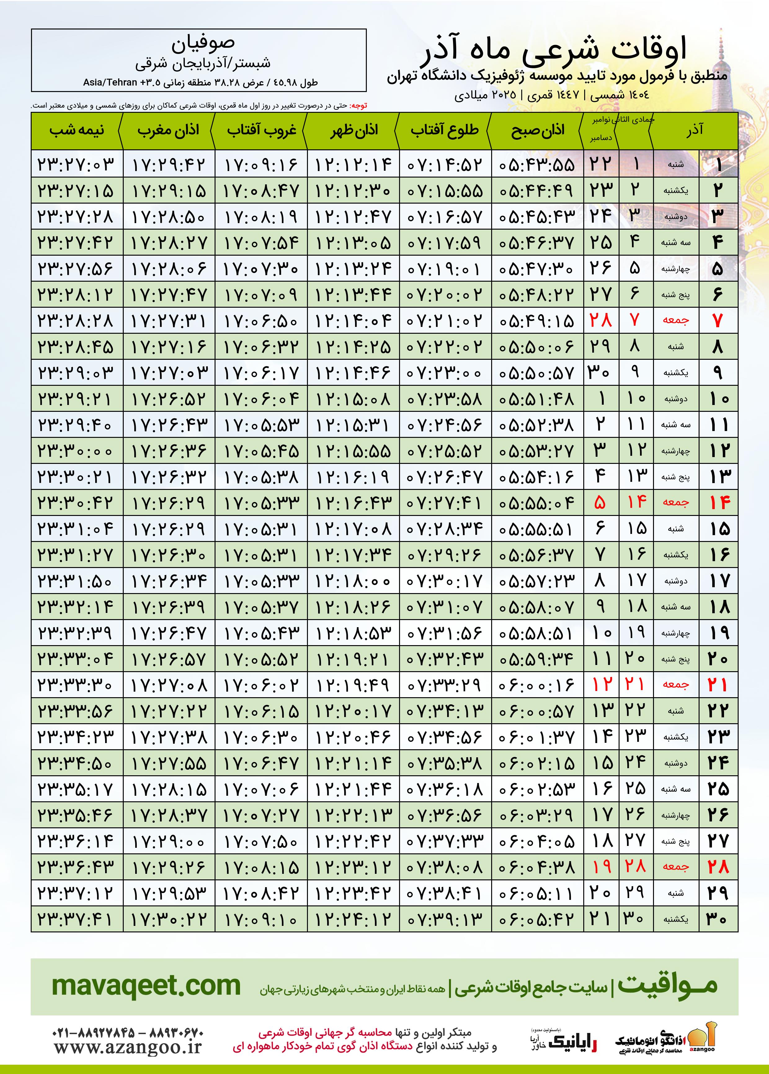 اوقات شرعی آذر ١٤٠٤ شمسی شهر صوفیان
