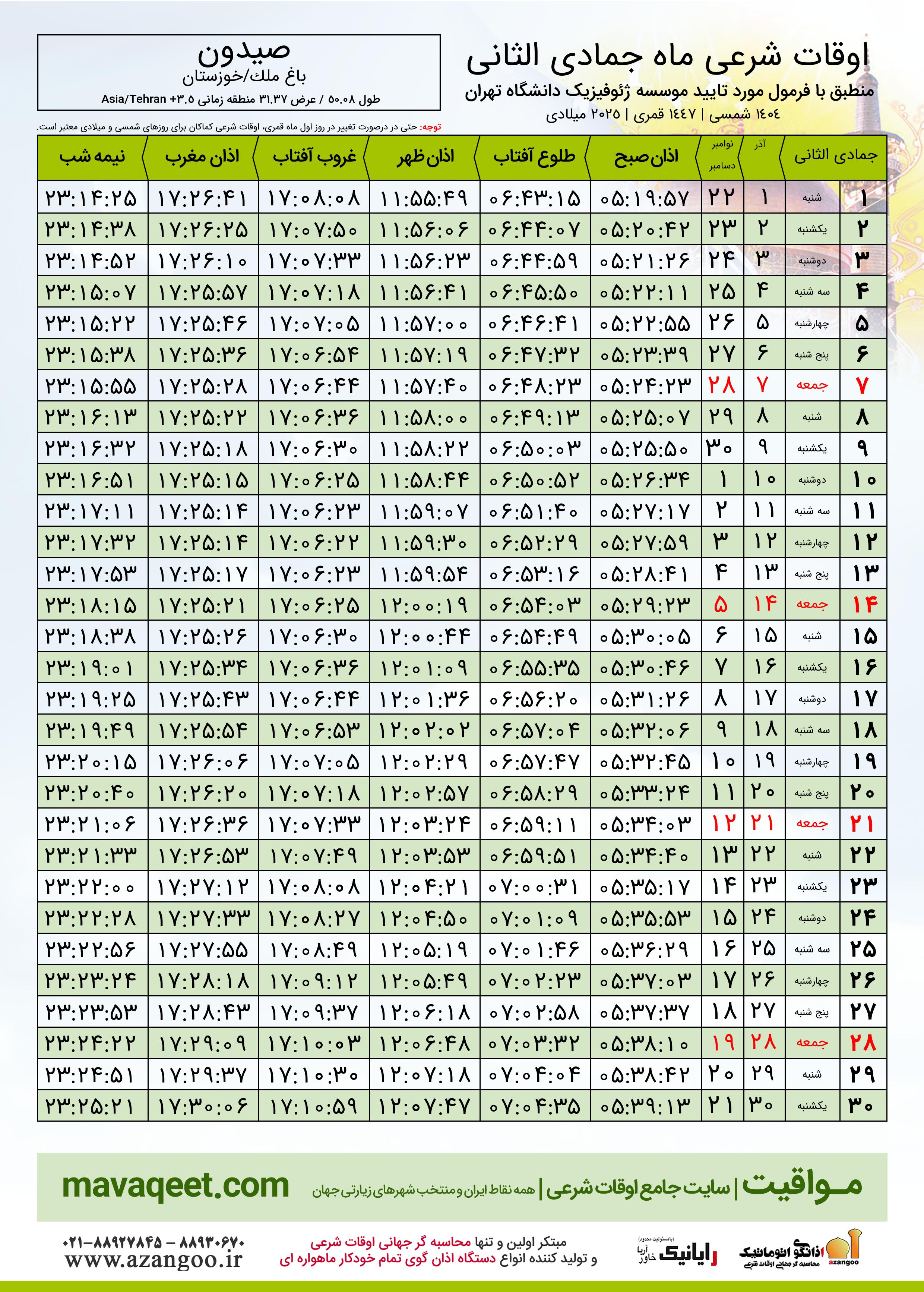 اوقات شرعی ماه جمادی الثانی ١٤٤٧ هـ.ق شهر صیدون بر