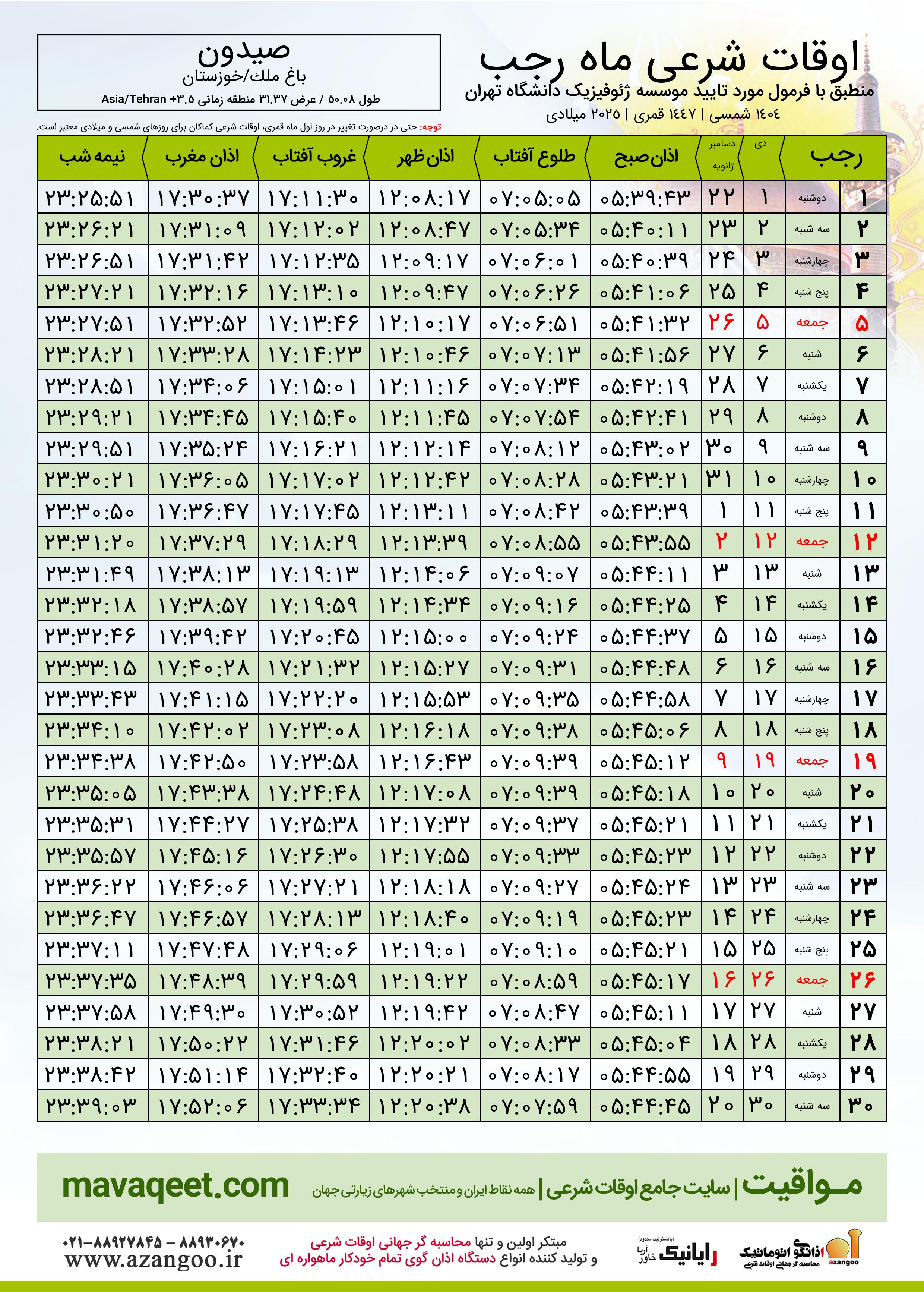 دانلود اوقات شرعی ماه رجب ١٤٤٧ هـ.ق