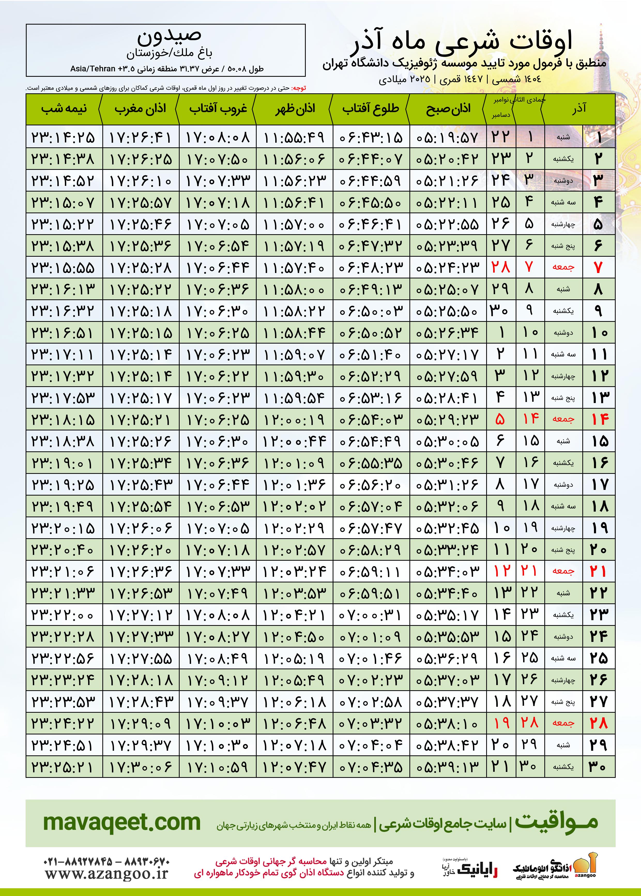 جدول اوقات شرعی آذر ١٤٠٤ شمسی شهر صیدون