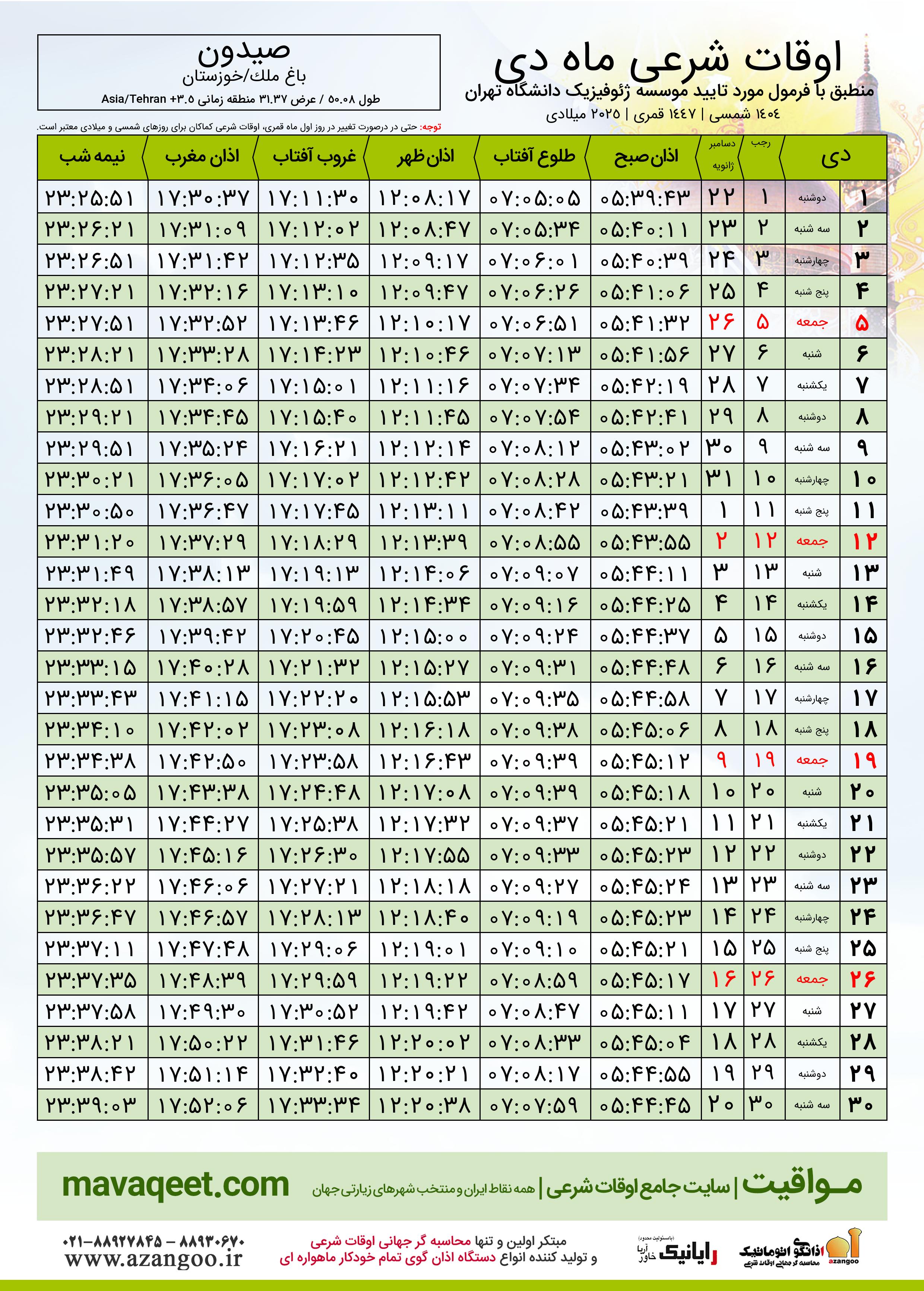 اوقات شرعی دی ١٤٠٤ شمسی شهر صیدون