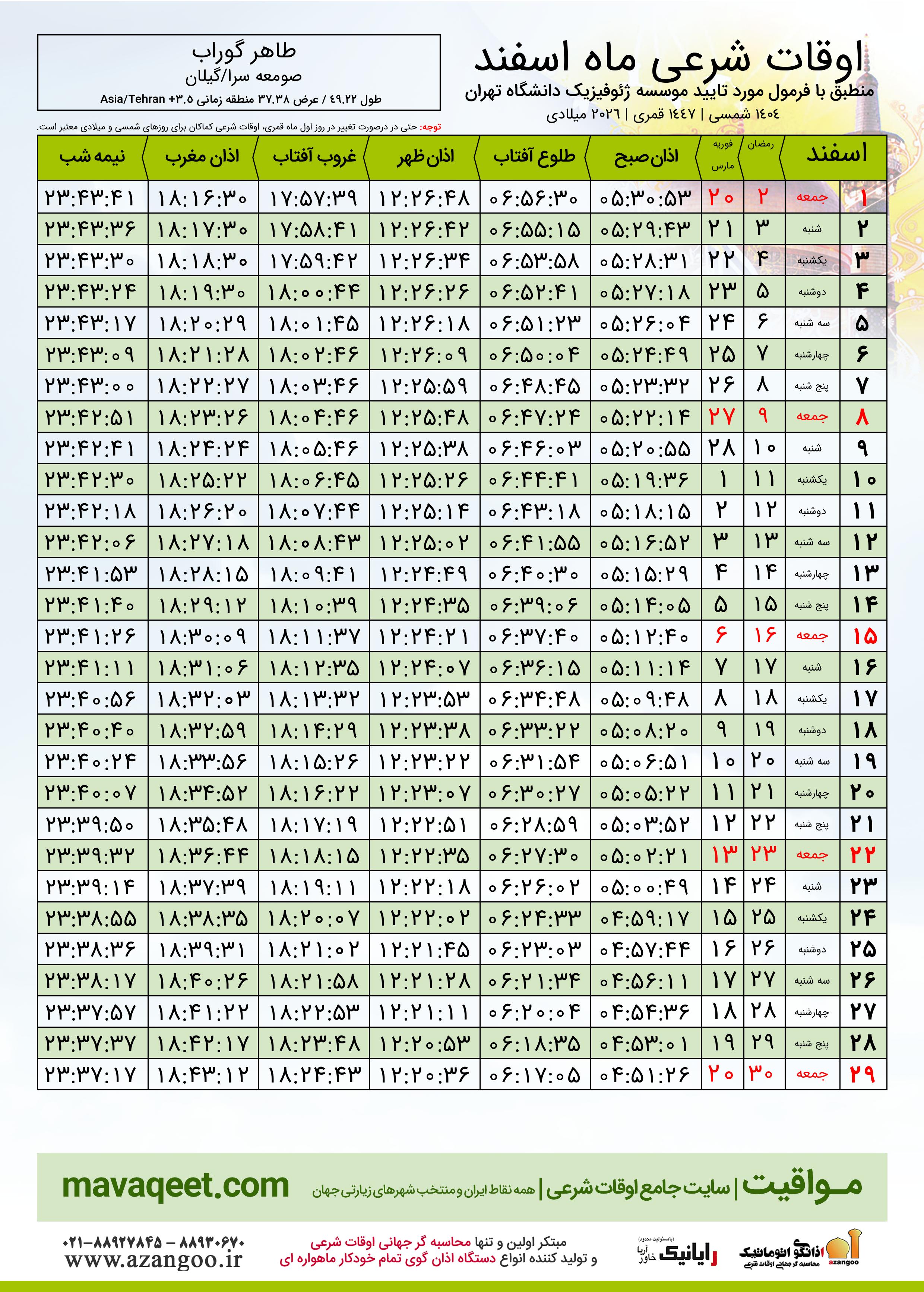 اوقات شرعی ماه رمضان شهر طاهر گوراب ١٤٠٤ - ٠٤ شمسی | ٢٠٢٦ میلادی
