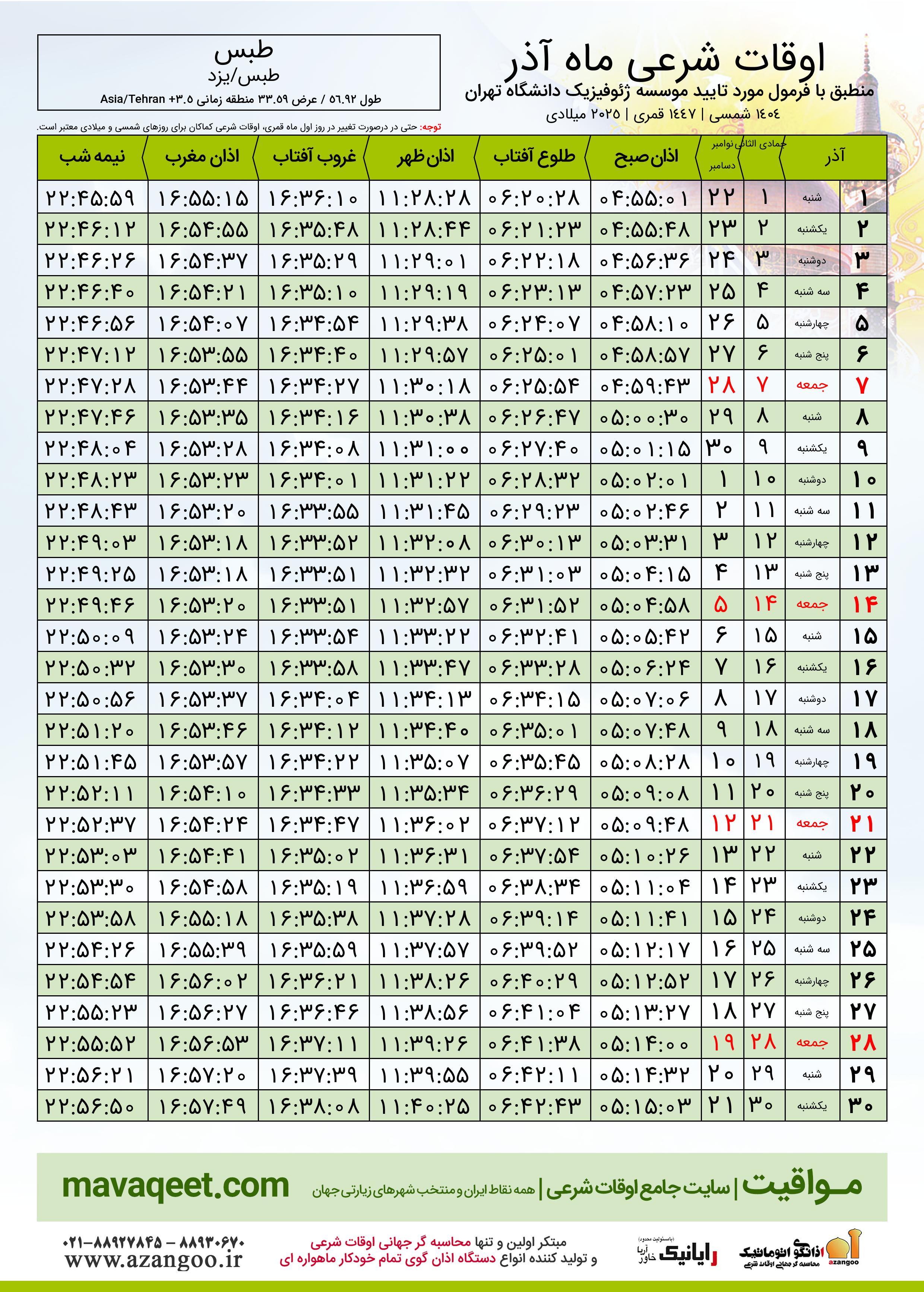 دانلود اوقات شرعی آذر ٠٤ - ١٤٠٤ شهر طبس