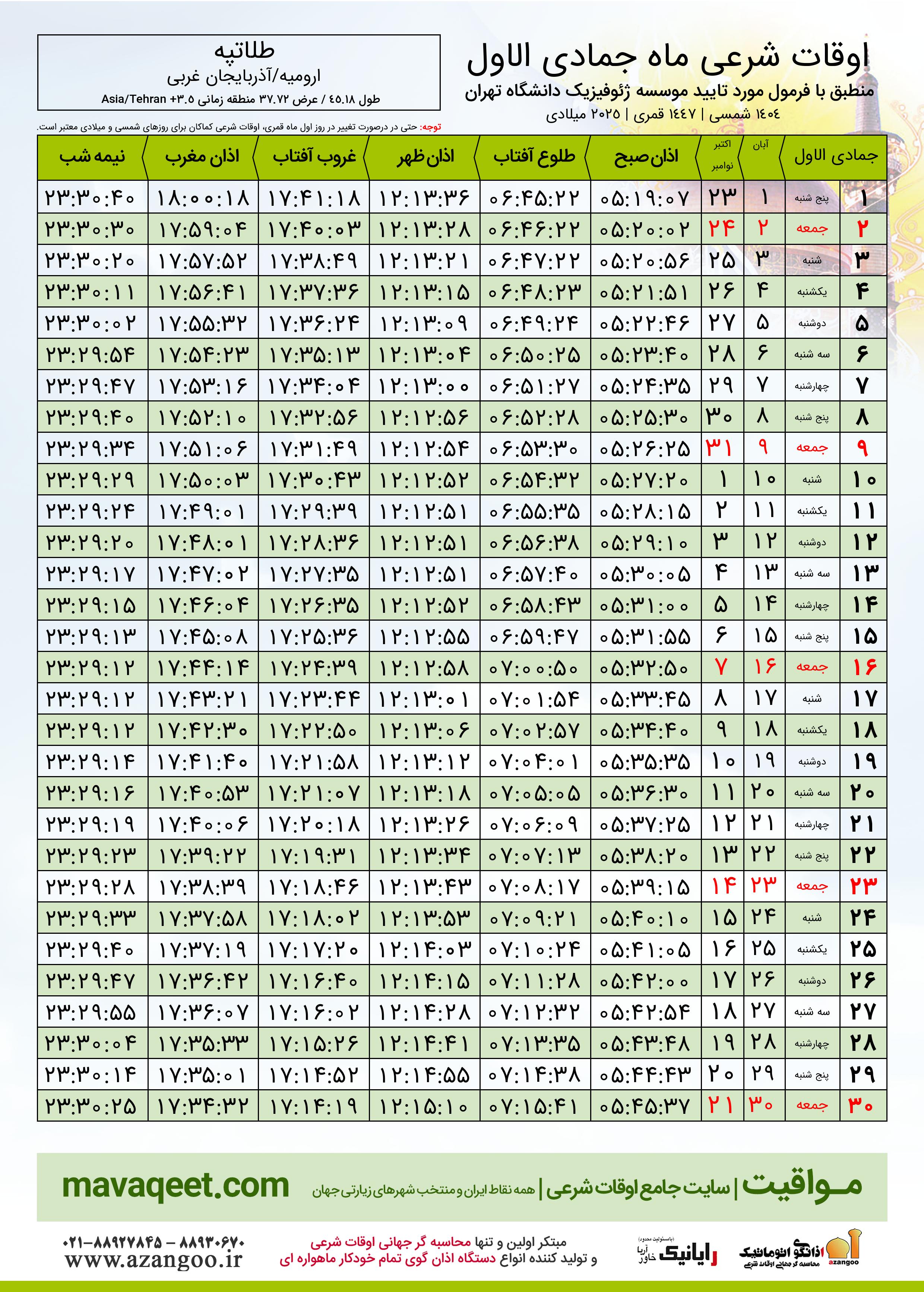 دانلود اوقات شرعی ماه جمادی الاول ١٤٤٧ هـ.ق