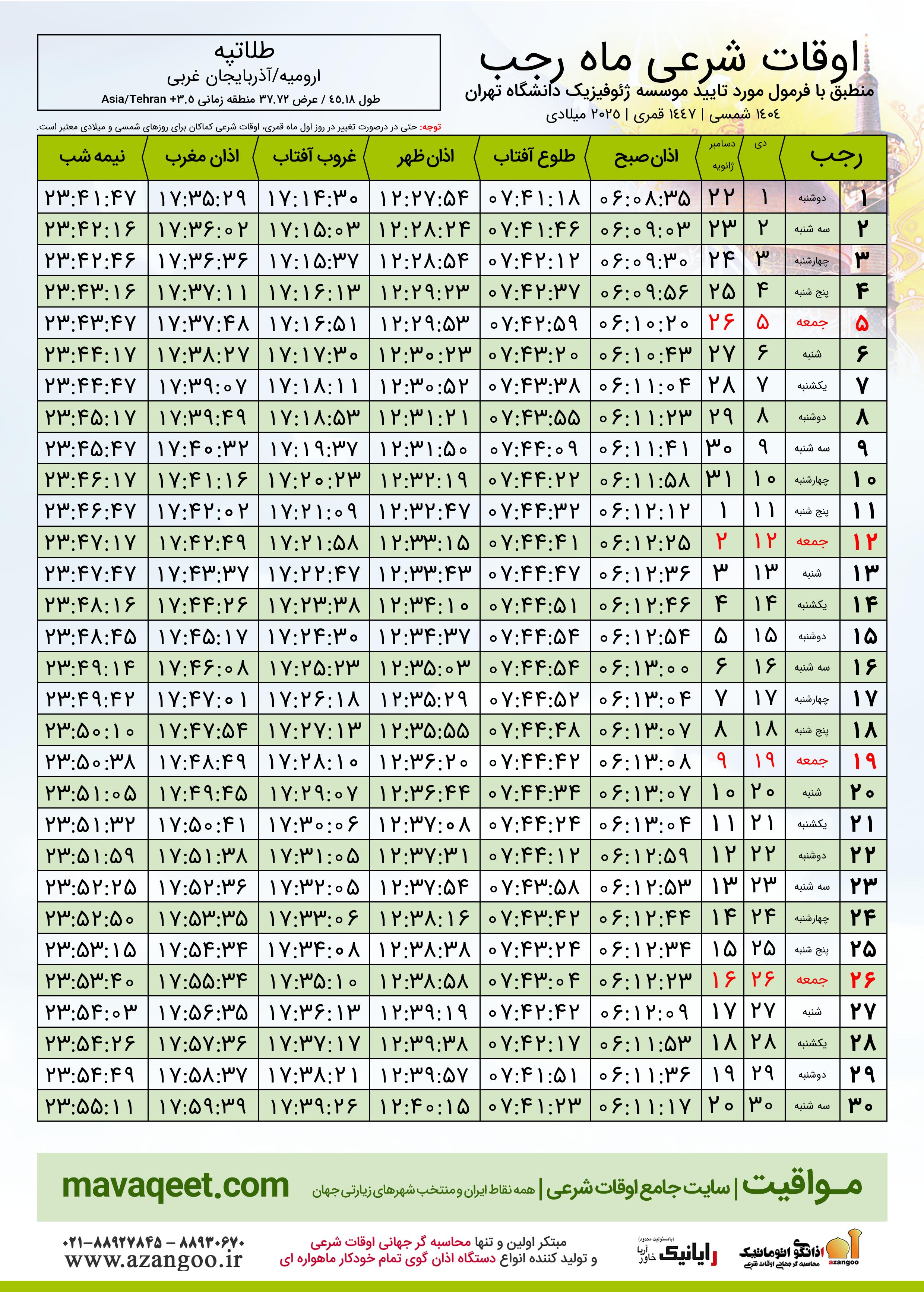 اوقات شرعی ماه رجب ١٤٤٧ هـ.ق شهر طلاتپه بر
