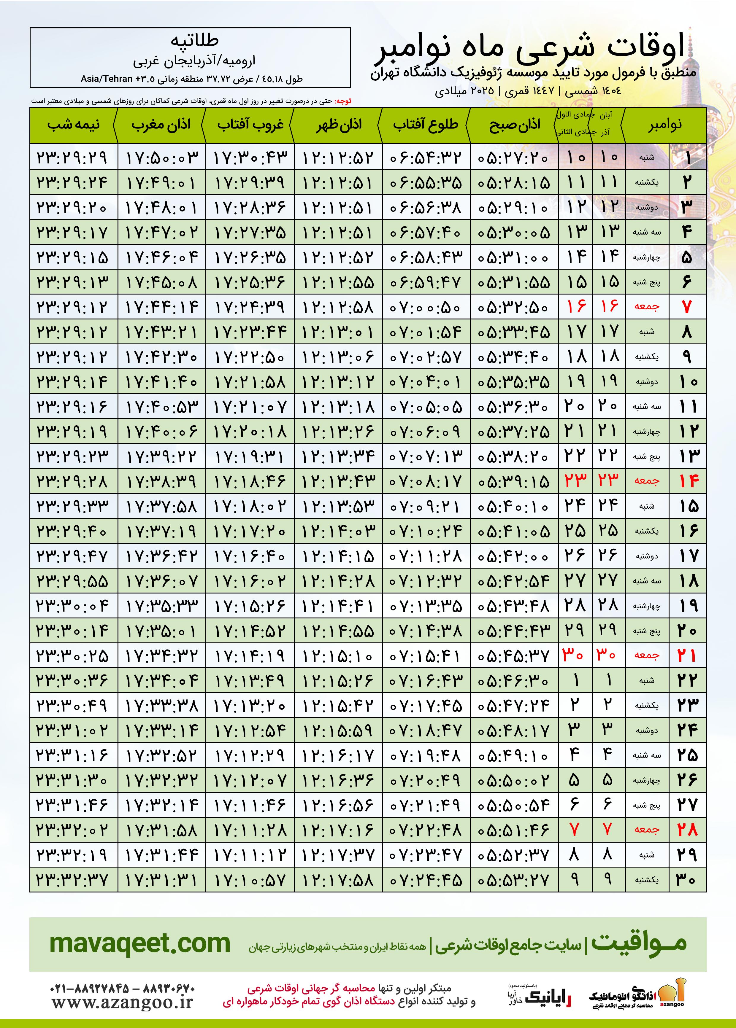 جهت نمایش تصویر جدول اوقات شرعی جدول اوقات شرعی نوامبر ٢٠٢٥ میلادی شهر طلاتپه شهر طلاتپه در اندازه