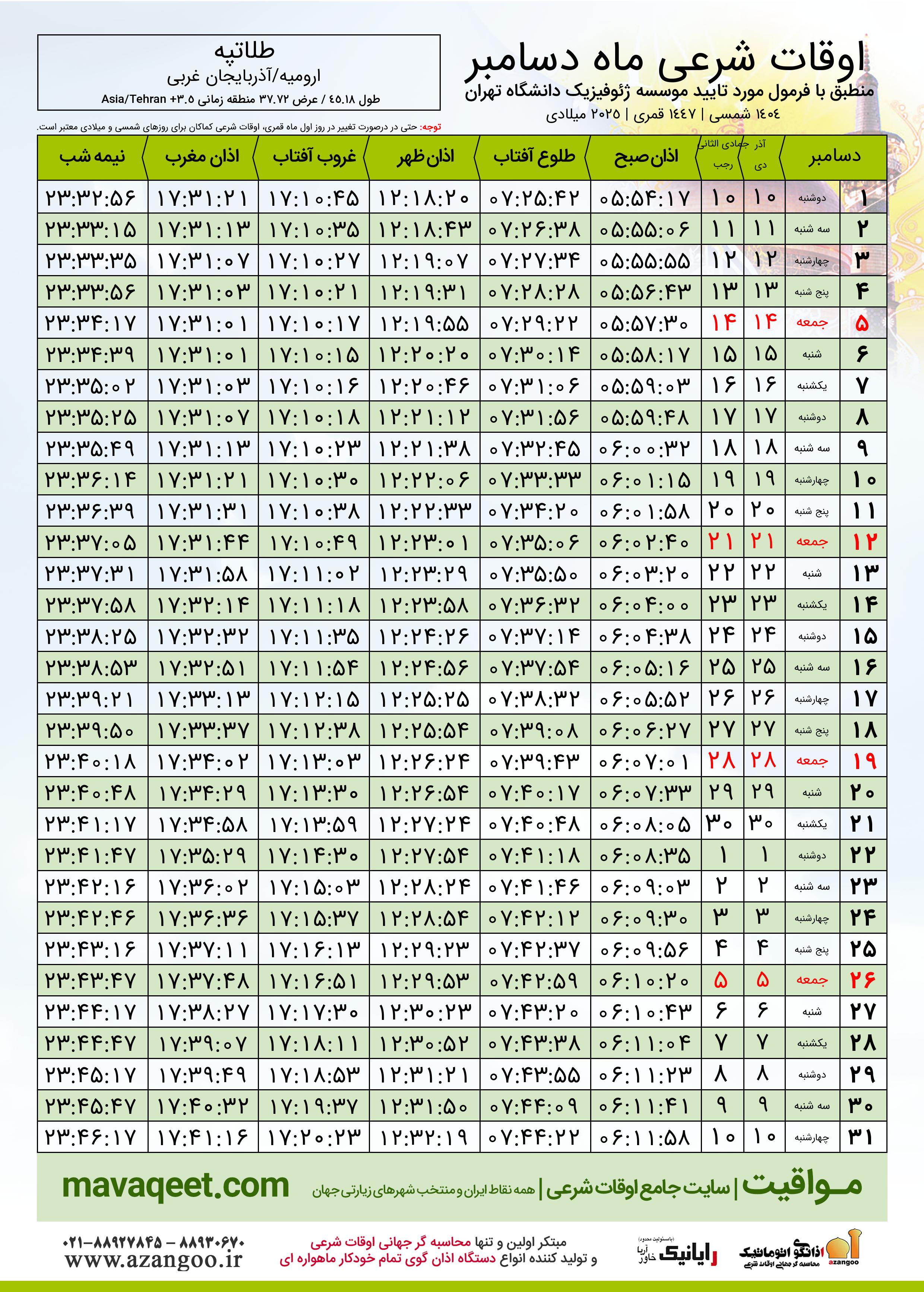 جهت نمایش تصویر جدول اوقات شرعی جدول اوقات شرعی دسامبر ٢٠٢٥ میلادی شهر طلاتپه شهر طلاتپه در اندازه