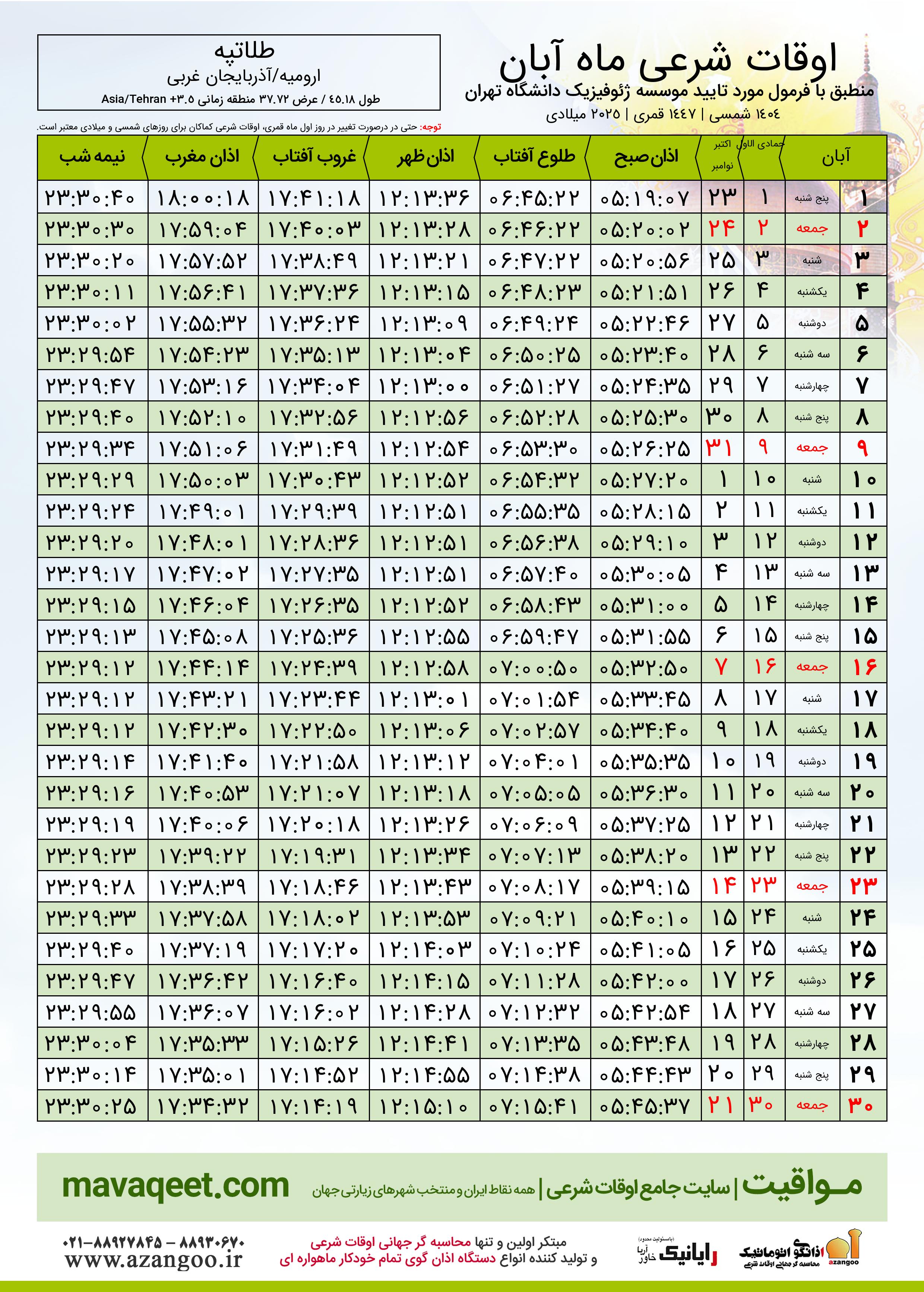 اوقات شرعی آبان ١٤٠٤ شمسی شهر طلاتپه