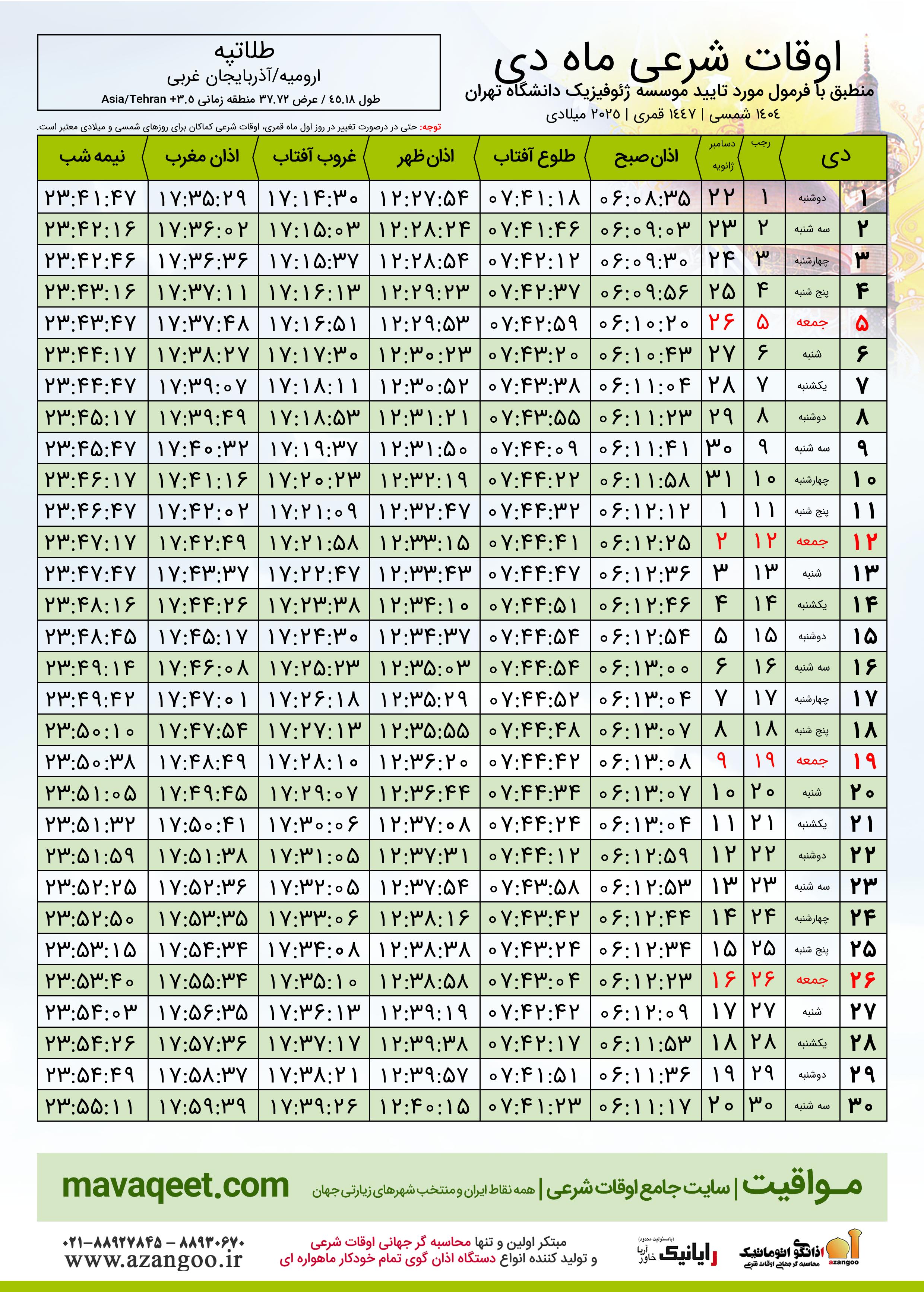 دانلود اوقات شرعی دی ٠٤ - ١٤٠٤ شهر طلاتپه