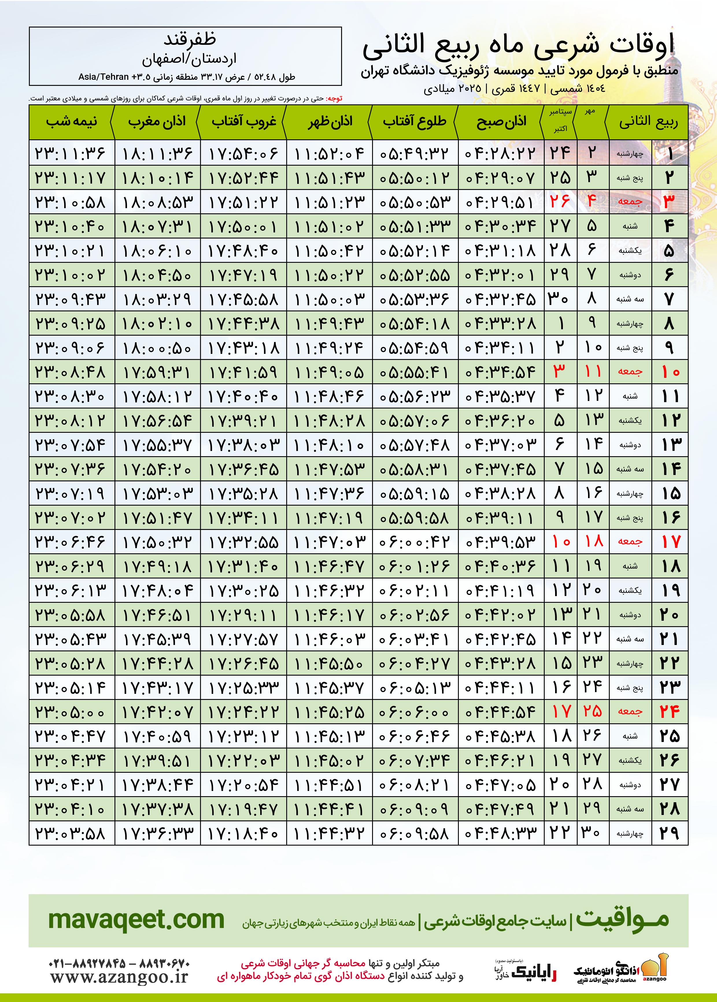 اوقات شرعی ماه ربیع الثانی ١٤٤٧ هـ.ق شهر ظفرقند بر