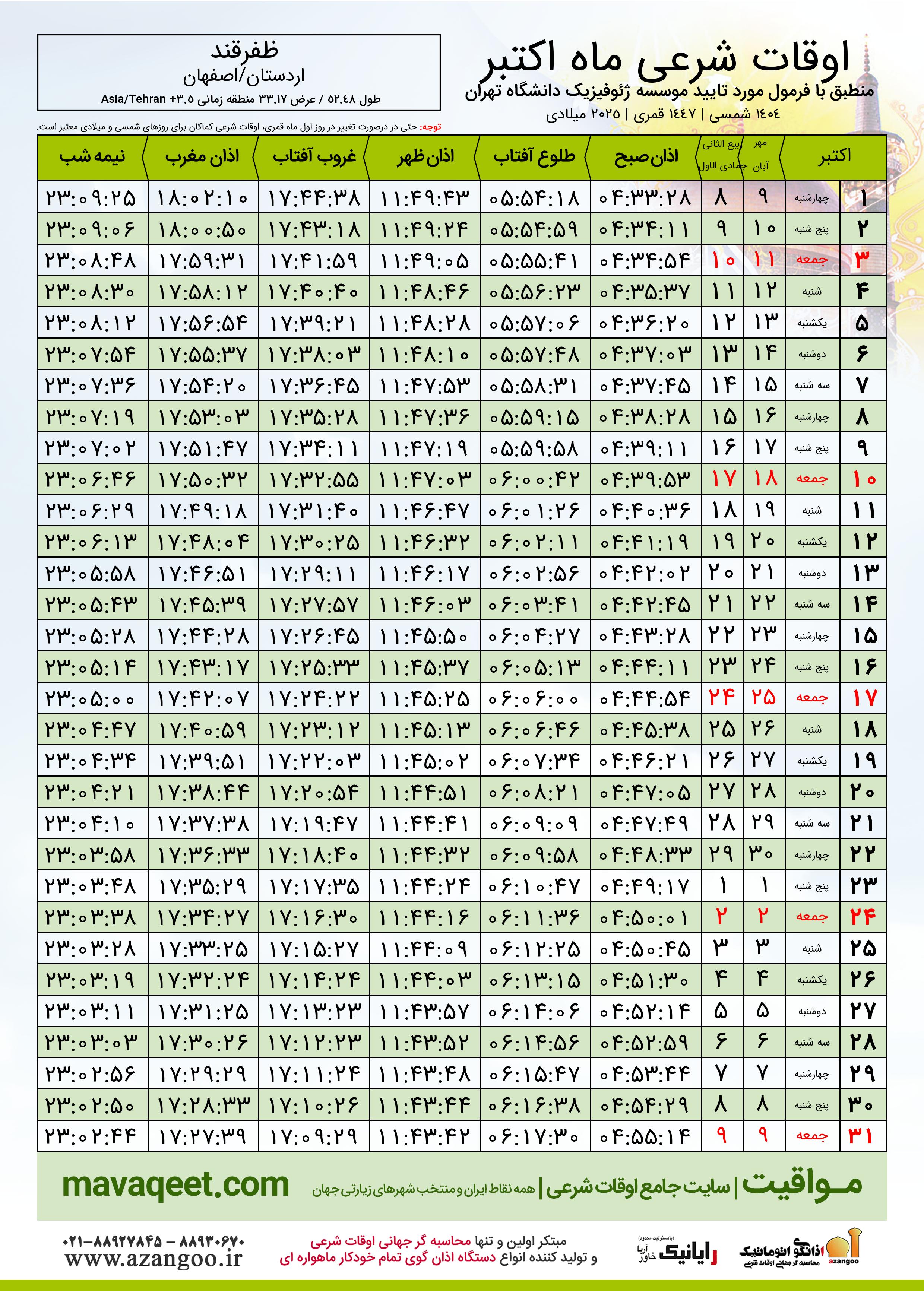 دانلود اوقات شرعی اکتبر ٢٠٢٥ شهر ظفرقند